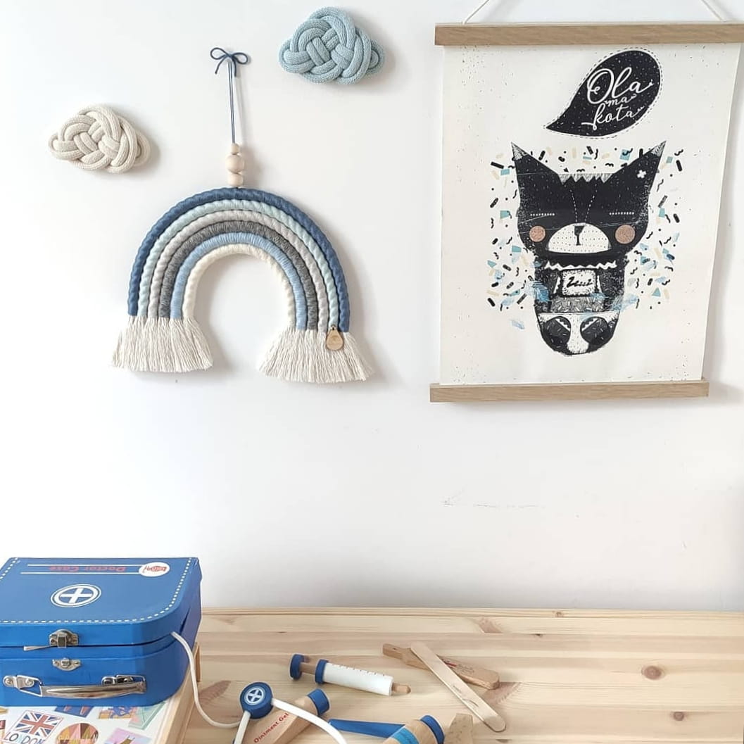 Makrama tęcza składa się z 6 idealnie dobranych kolorów w odcieniach niebieskiego i błękitu, przełamane szarością i kremem.
