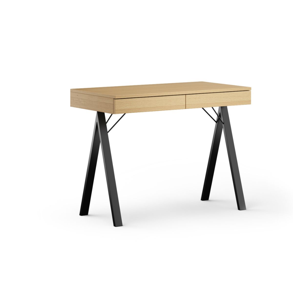 Biurko wyposażone jest w dwie pojemne szuflady z niezawodnymi prowadnicami BLUM, które gwarantują ciche i płynne zamykanie. Subtelnie ukryte pod blatem, pozostają niemal niewidoczne, zachowując minimalistyczny wygląd mebla.