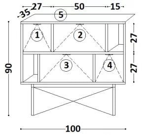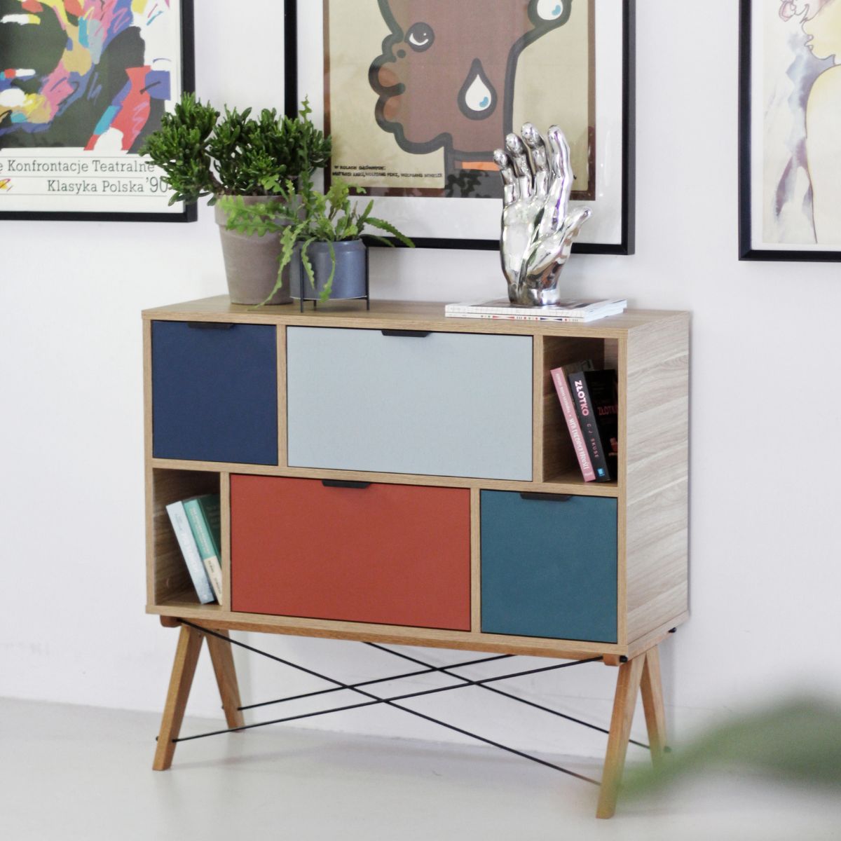 Komoda posiada cztery klapy otwierane do dołu oraz dwa otwarte segmenty, ułożone w asymetryczny sposób, co nadaje meblowi oryginalny i ciekawy wygląd. Dzięki temu świetnie wpasuje się zarówno w eleganckie, jak i minimalistyczne wnętrza, dodając im koloru i charakteru.