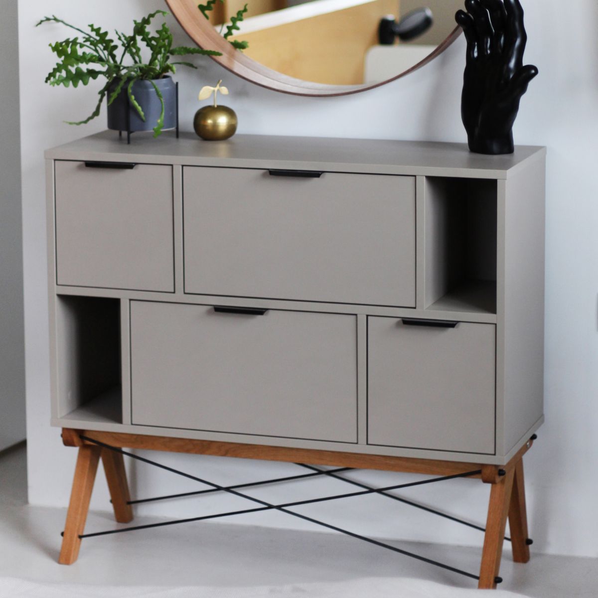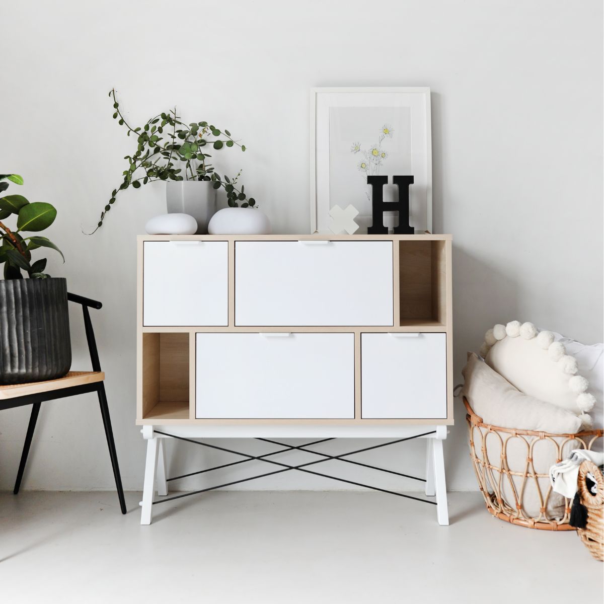 Komoda Asymetric Midi to designerski mebel w stylu skandynawskim, osadzony na drewnianych nóżkach ze stelażem zdobionym charakterystycznymi dla marki Minko drucikami. To połączenie estetyki, funkcjonalności i nowoczesnego designu, które ożywi każde wnętrze.