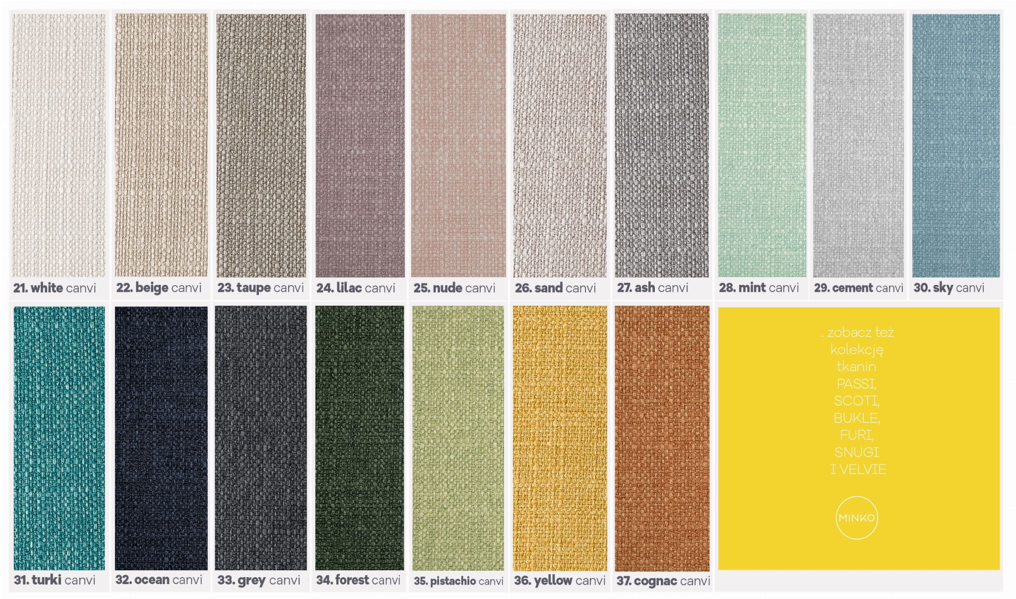 Kolekcja Canvi, czyli tkanina o widocznym splocie a’la “len”- jest elegancka, stonowana, neutralna w dotyku. Tkanina ma wiele przygaszonych kolorów, więc idealnie nadaje się do pastelowych pokoi dziecięcych. Tkanina jest odporna na ścieranie, jednak może się zaciągać, dlatego nie polecamy jej do domów, które zamieszkują czworonogi.