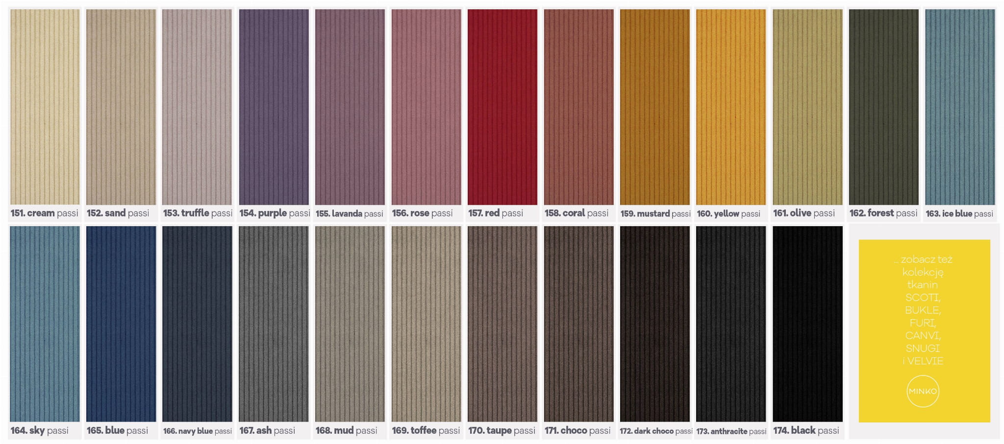 Kolekcja Passi, czyli tkanina sztruksowa- jest mięsista, miękka, ma niespotykane, intensywne kolory. Tkanina ma dłuższy “włos”, a jej odcienie zmieniają się po przeczesaniu mebla ręką. Sztruksy są łatwe w utrzymaniu czystości (tutaj jest dodatkowo apertura ochronna, więc wylany płyn zbiera się w krople i nie wnika w mebel, co nie zmienia faktu, że należy wytrzeć zabrudzenia jak najszybciej od zdarzenia). Tkanina jest bardzo odporna na ścieranie i trudno ja zaciągnąć, więc polecamy ją do domów, które zamieszkują czworonogi.