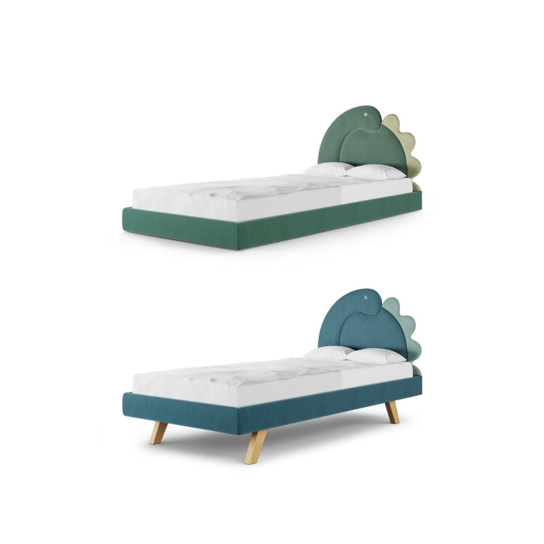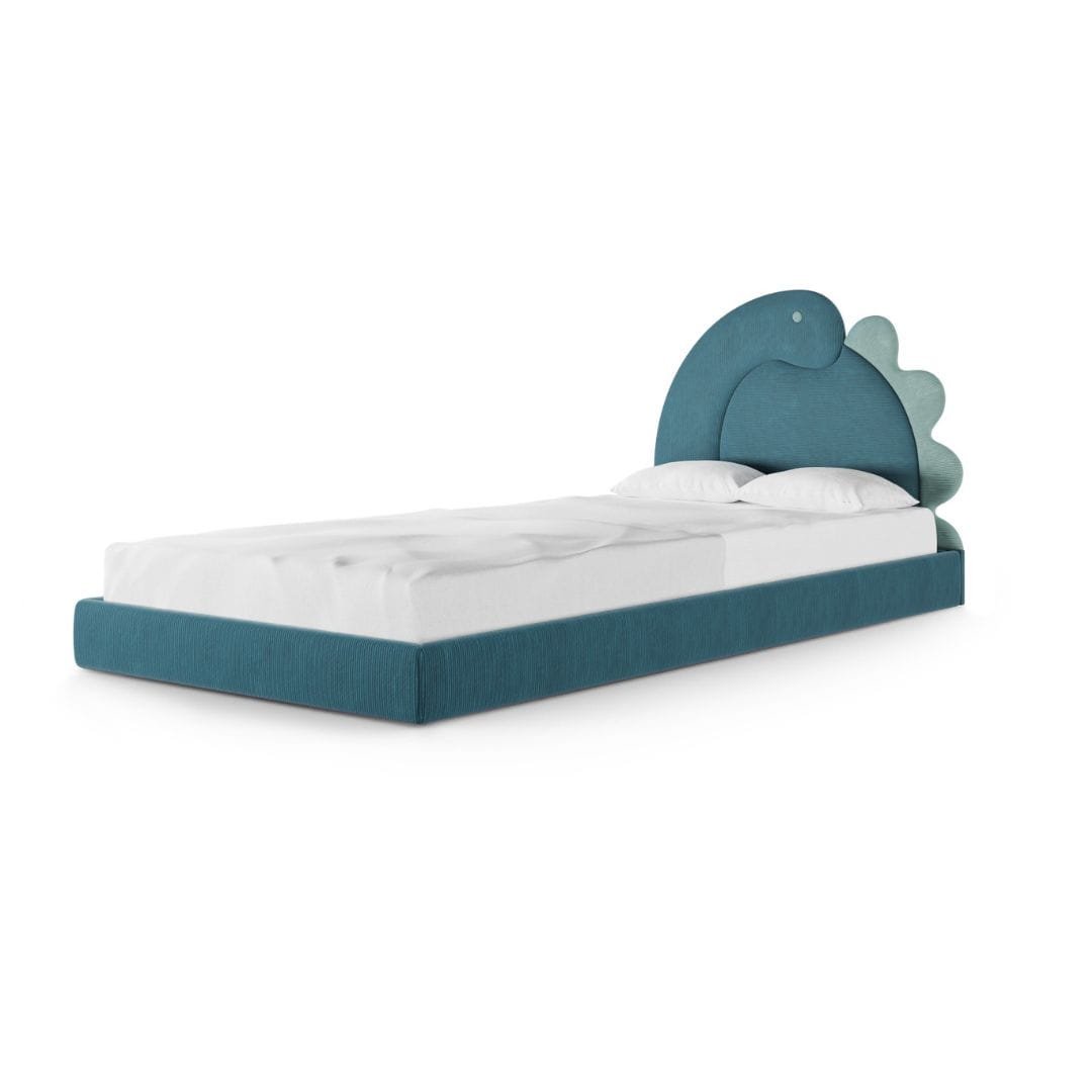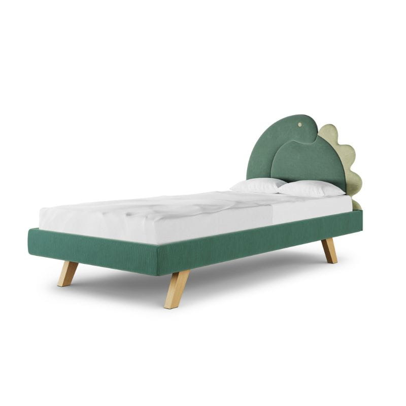 Kolor tapicerki łóżka dziecięcego został wybrany z palety tkanin PASSI (tkanina sztruksowa). Do wyboru masz dwa kolory dinozaura, możesz wybrać również jego stronę.