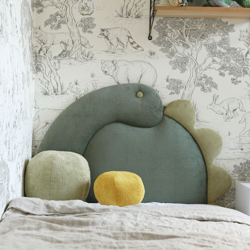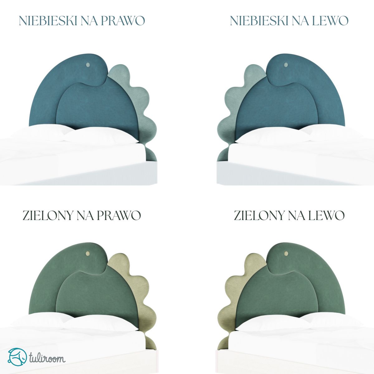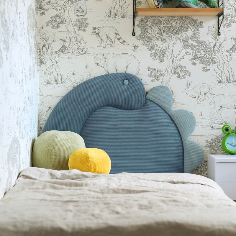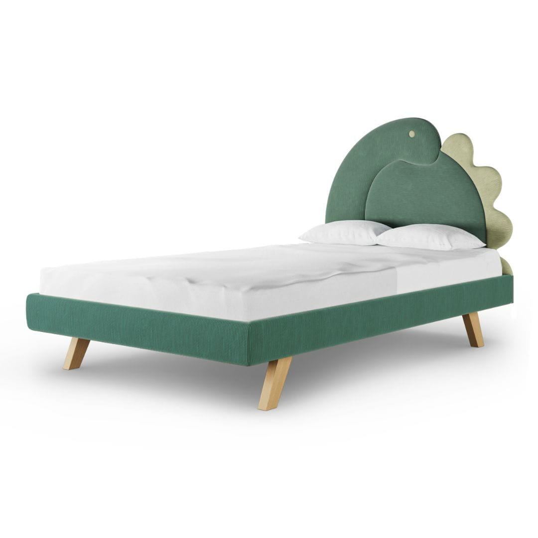 Kolor tapicerki łóżka dziecięcego został wybrany z palety tkanin PASSI (tkanina sztruksowa). Do wyboru masz dwa kolory dinozaura, możesz wybrać również jego stronę.