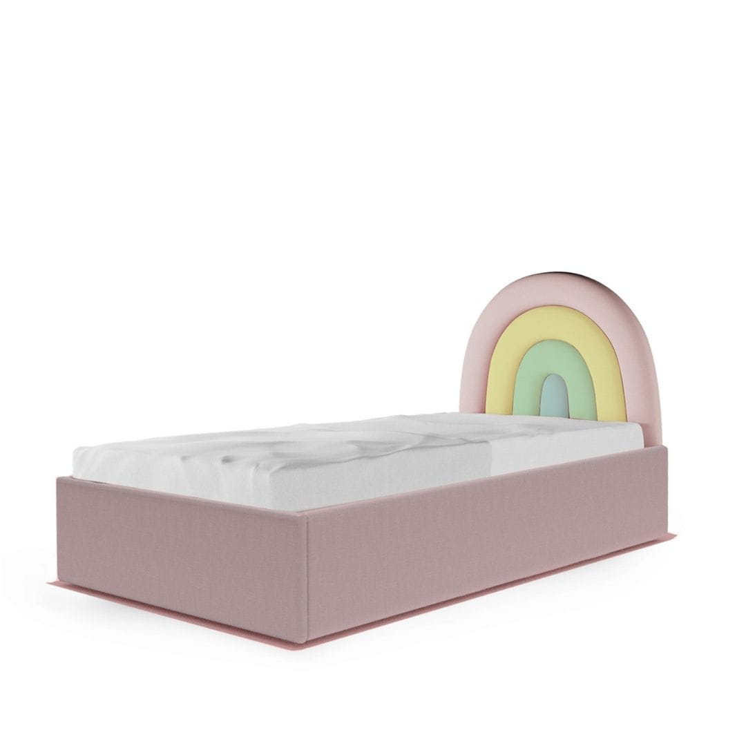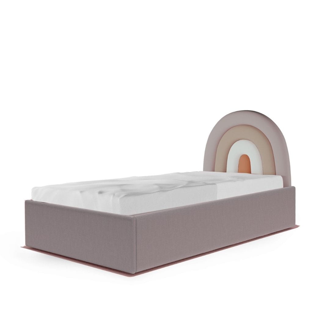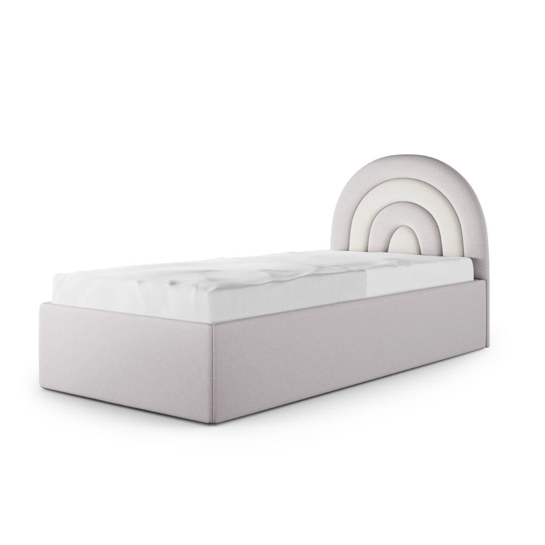 Łóżko Tęcza Box Texti jest w całości tapicerowane. Zagłówek w kształcie tęczy, który dodaje łóżku wyjątkowego charakteru, dostępny jest w czterech starannie dobranych paletach kolorystycznych. Możesz wybierać spośród: