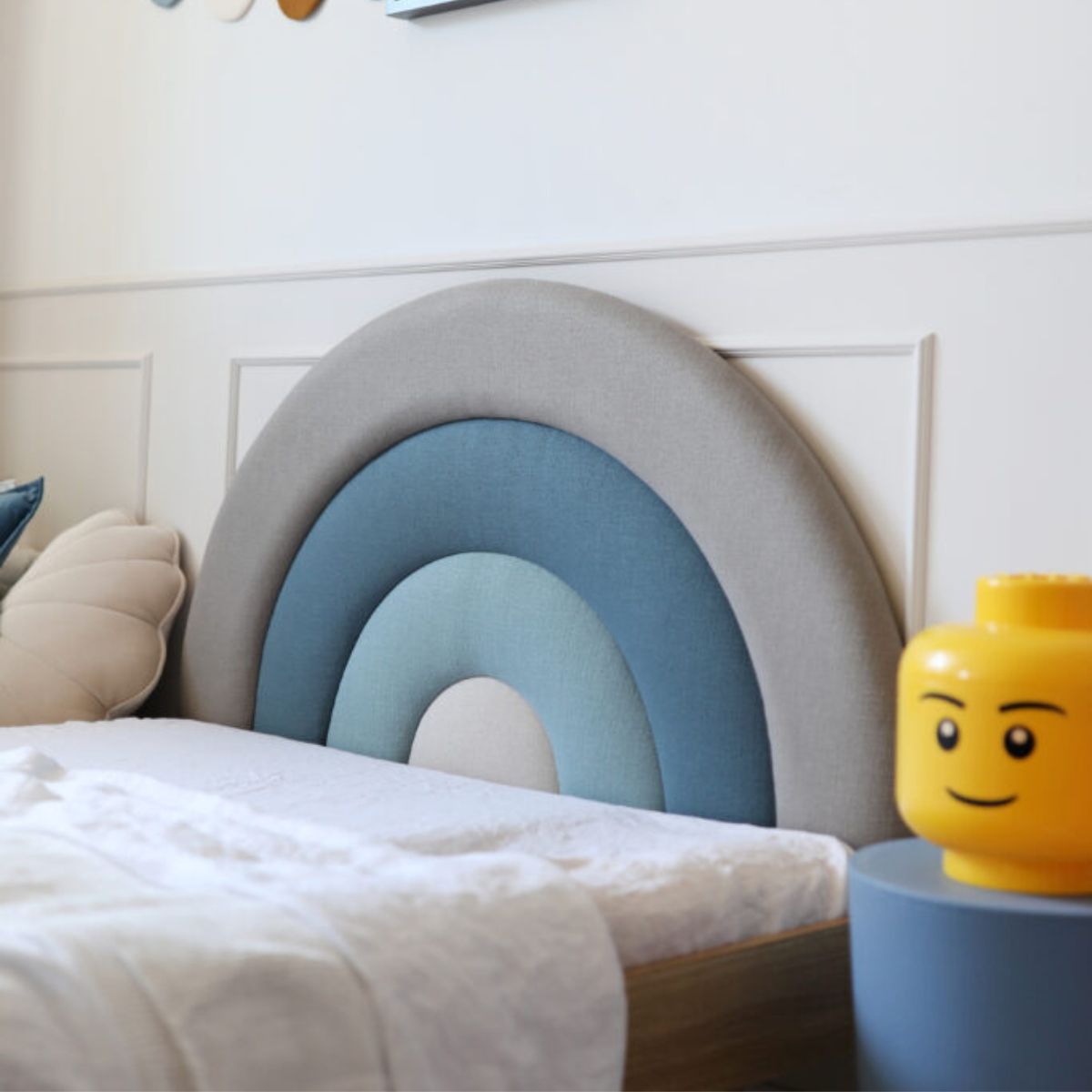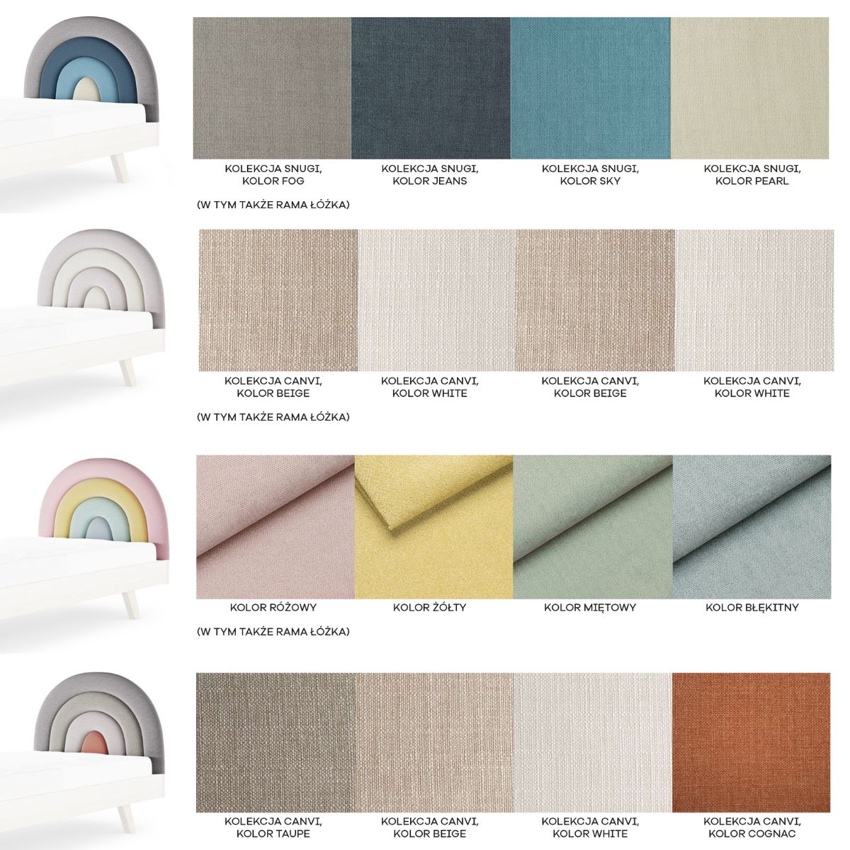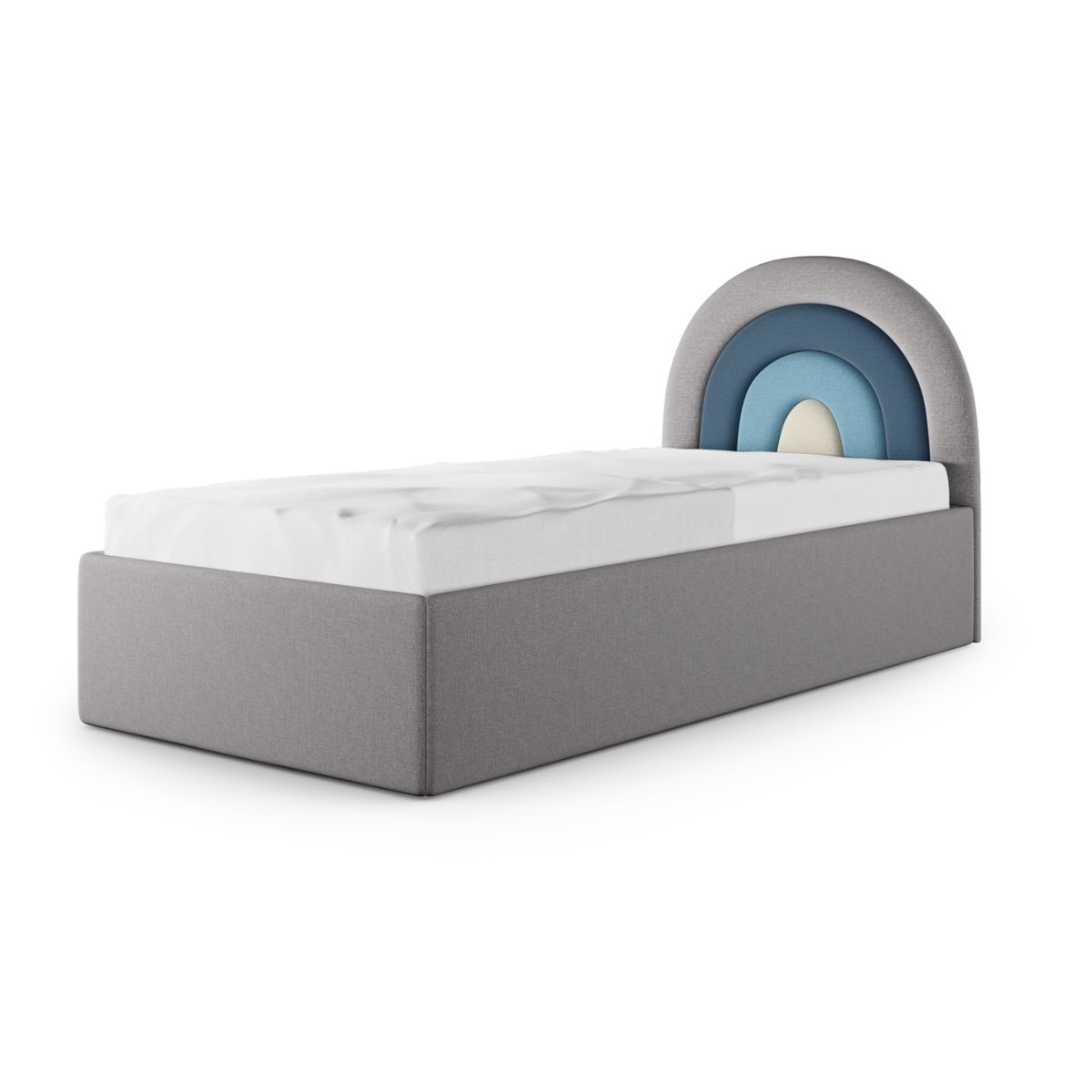Łóżko Tęcza Box Texti jest w całości tapicerowane. Zagłówek w kształcie tęczy, który dodaje łóżku wyjątkowego charakteru, dostępny jest w czterech starannie dobranych paletach kolorystycznych. Możesz wybierać spośród: