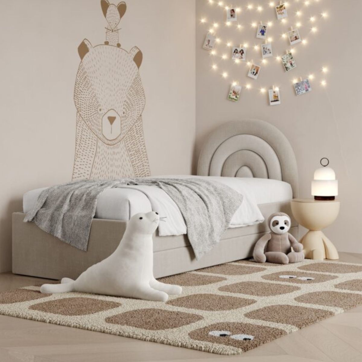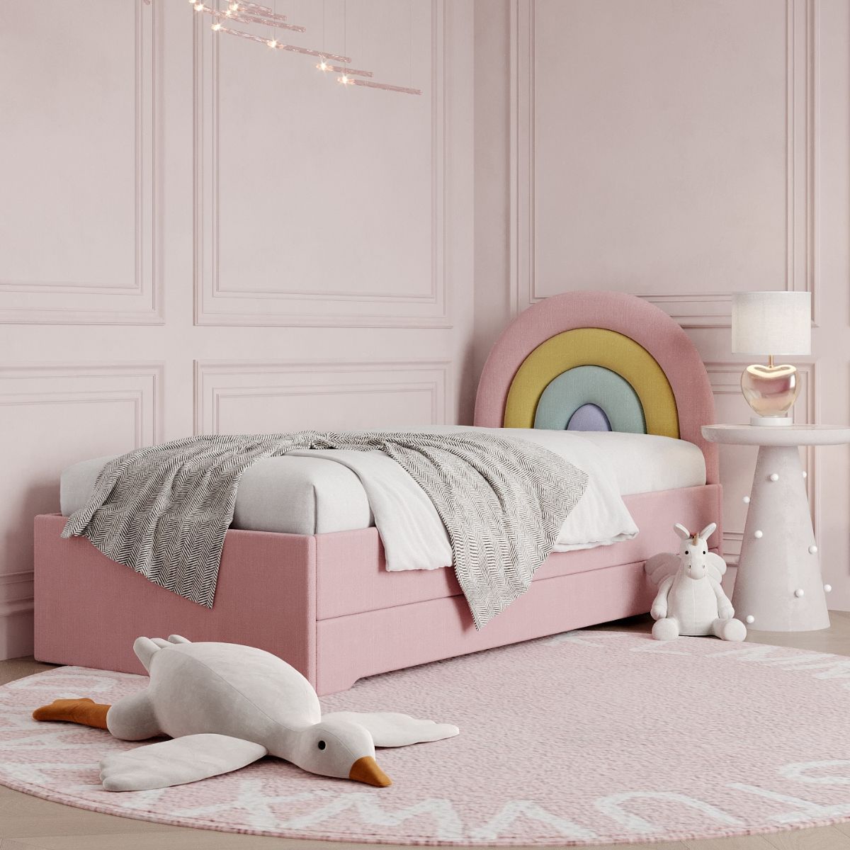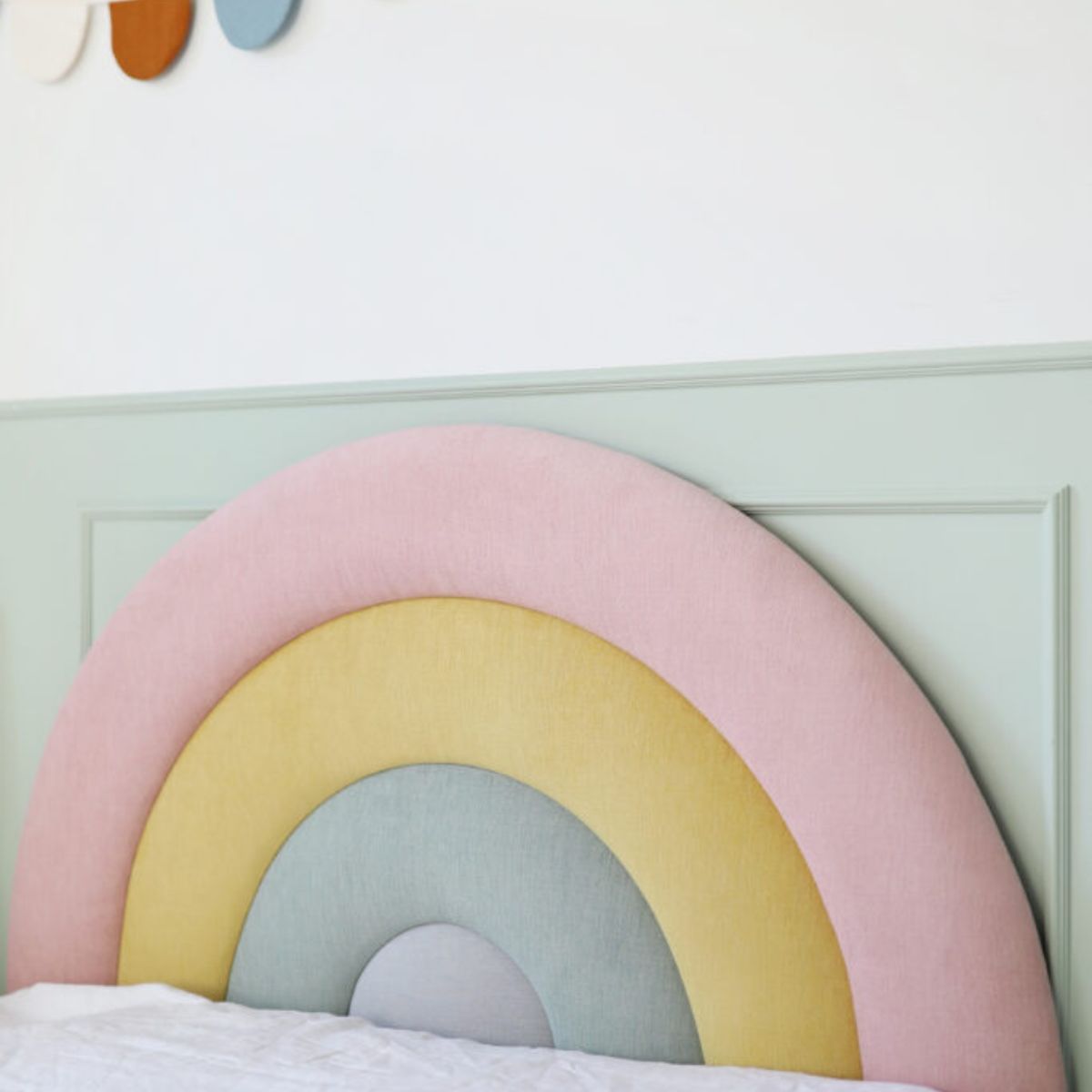 Łóżko Tęcza jest w całości tapicerowane. Zagłówek w kształcie tęczy, który dodaje łóżku wyjątkowego charakteru, dostępny jest w czterech starannie dobranych paletach kolorystycznych. Możesz wybierać spośród: