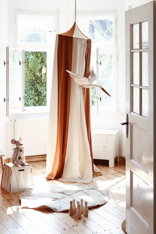 Baldachim będzie fajnym kącikiem do zabawy, na przykład w połączeniu z suchym basenem z kuleczkami lub materacykiem czy matą i poduszkami.