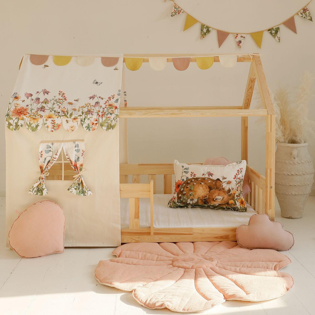 Każdy domek posiada: daszek z tkaniny dopasowanej do kolekcji, okienko z zasłonką, uroczą girlandę pod daszkiem oraz kieszonkę na dziecięce skarby, co sprawia, że całość wygląda jak bajkowa chatka. To nie tylko dekoracja, ale centralny punkt pokoju, który nadaje mu styl i wyjątkowy klimat.