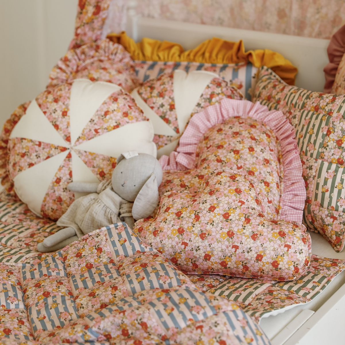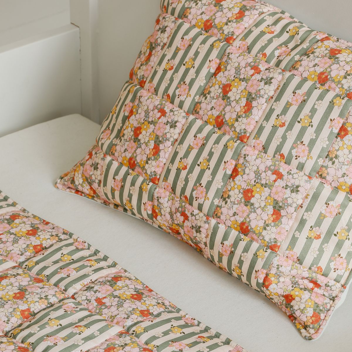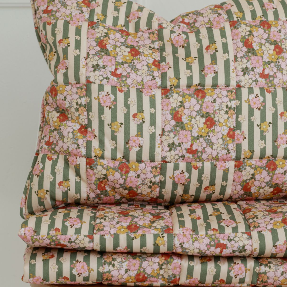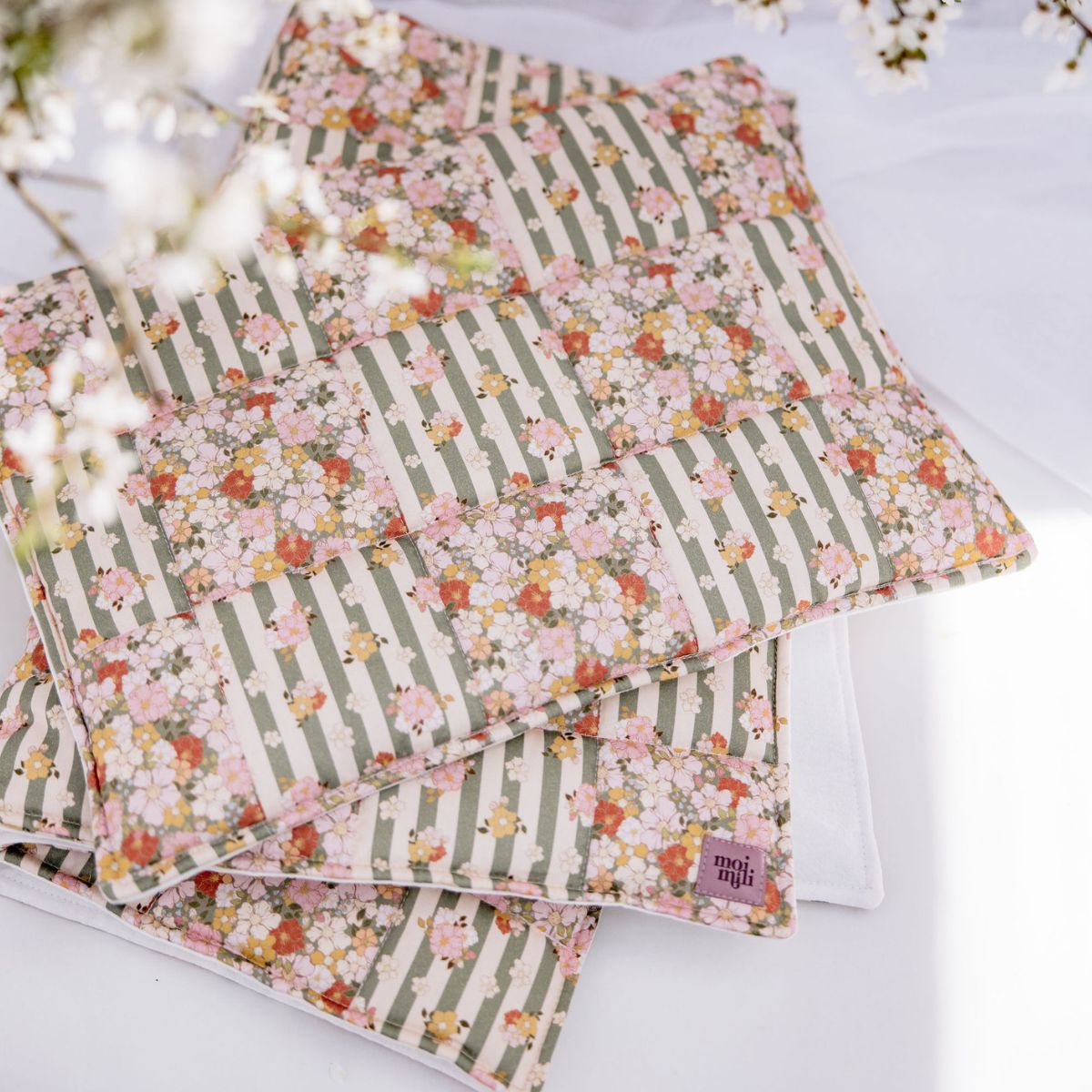 Całą powierzchnię ozdabia autorski wzór Katarzyny Goraj-Stróżyńskiej stworzony specjalnie dla Moi Mili. Motyw kwiatów i subtelnych paseczków tworzy harmonijną kompozycję patchworkowych kwadratów, które nadają pościeli lekkości i świeżości. Ten delikatny, pastelowy styl idealnie sprawdzi się w pokoju dziewczynki – zarówno w aranżacjach klasycznych, vintage, boho, jak i nowoczesnych.