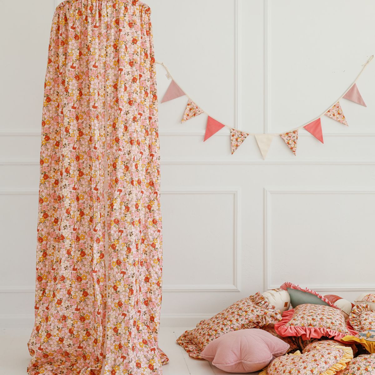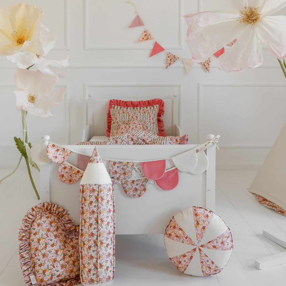 Z wyjątkowej tkaniny powstały najpiękniejsze produkty: namioty tipi, baldachimy, poduszki serca, poduszki z falbanką oraz poduszki w kształcie kredek. Cała kolekcja tworzy spójną, harmonijną linię dekoracji, które pozwalają wyczarować w domu atmosferę wiosennego ogrodu.