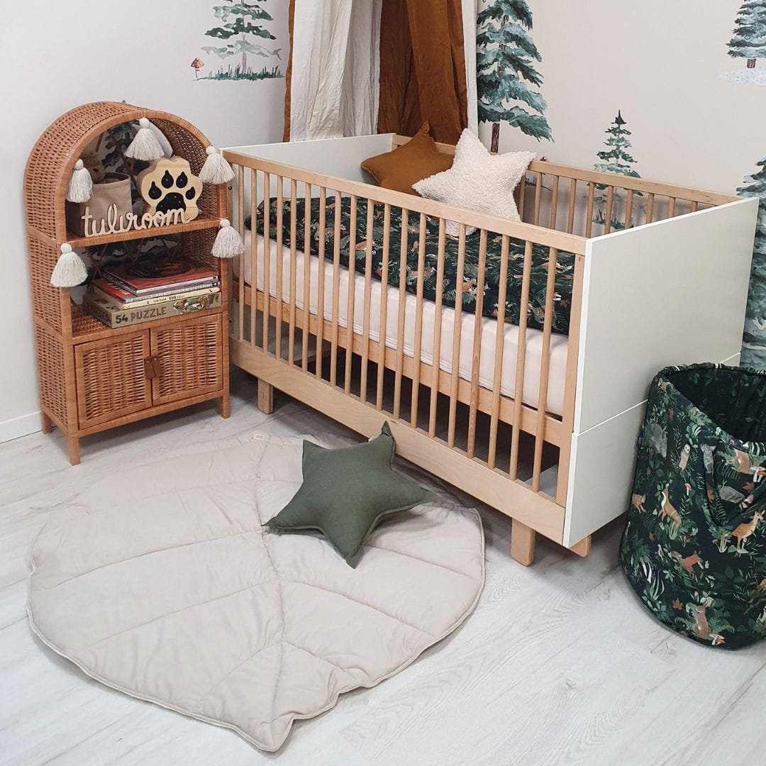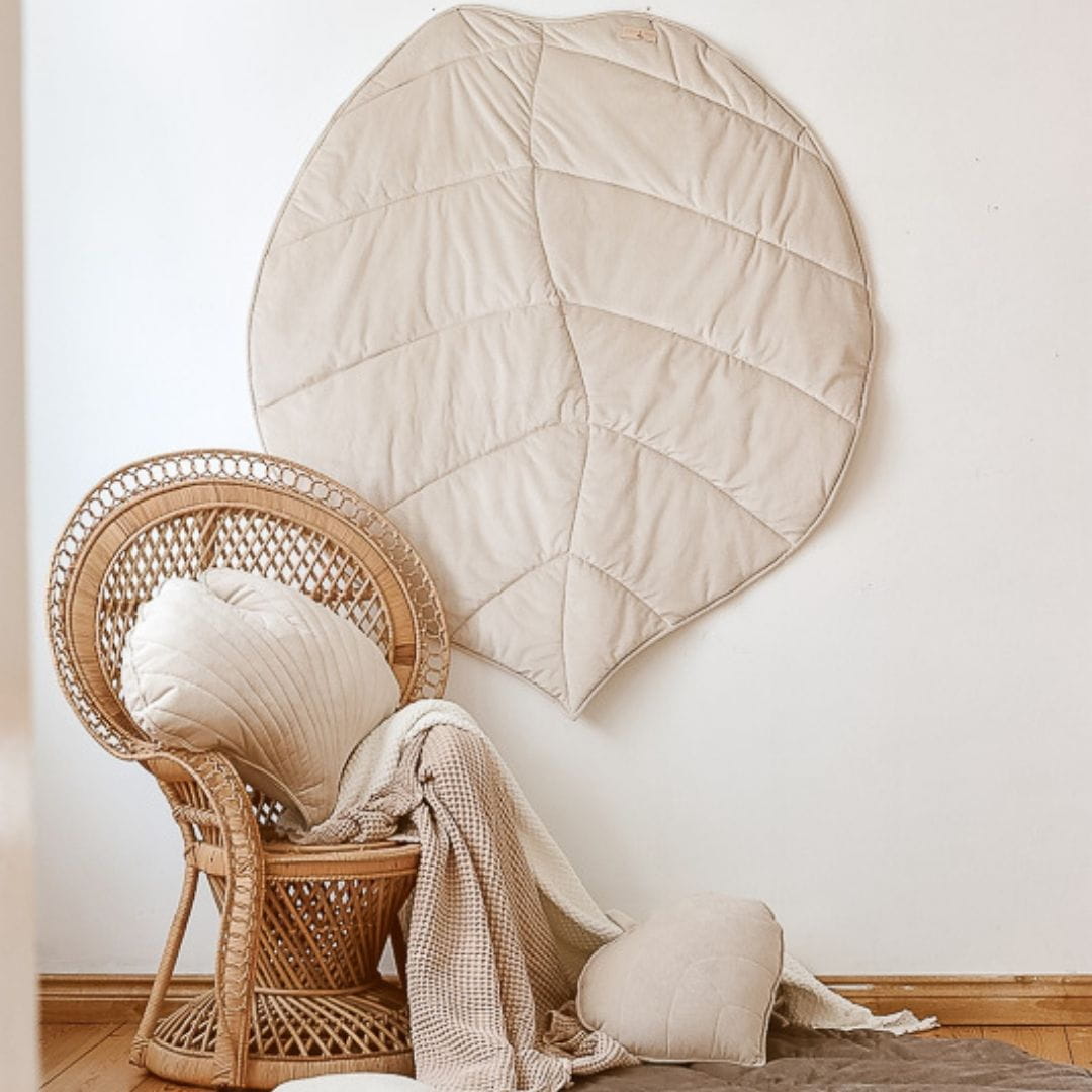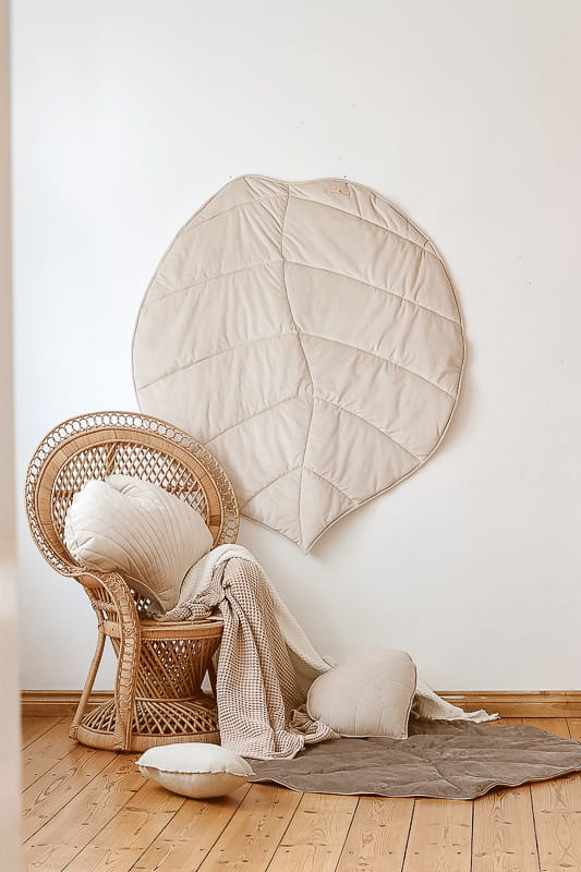 Mata dla dzieci w kształcie liścia jest dwustronna - wykonana jest z przyjemnego velvetu, a od spodu z bawełny. Piękny delikatny beż i naturalna bawełna to uniwersalne połączenie, które świetnie sprawdzi się w naturalnych wnętrzach.