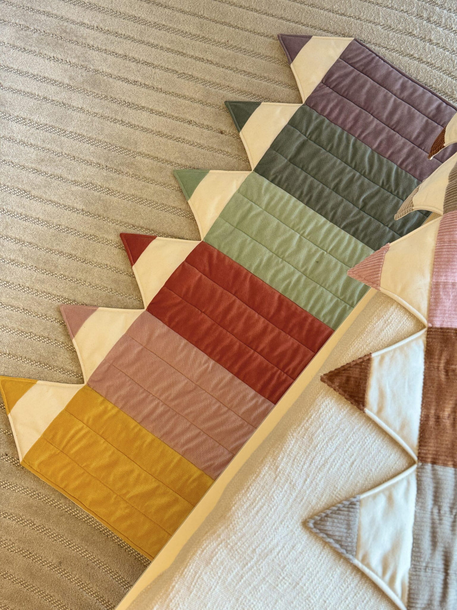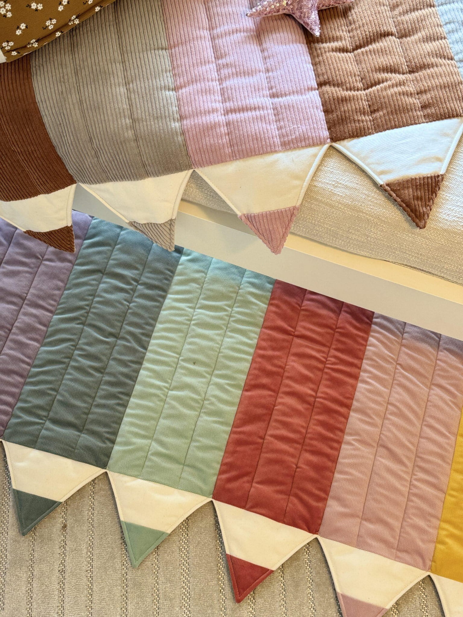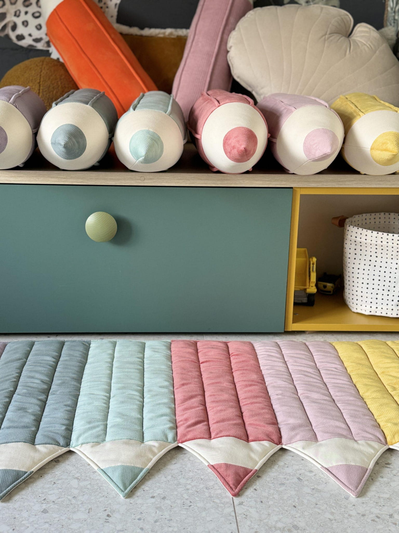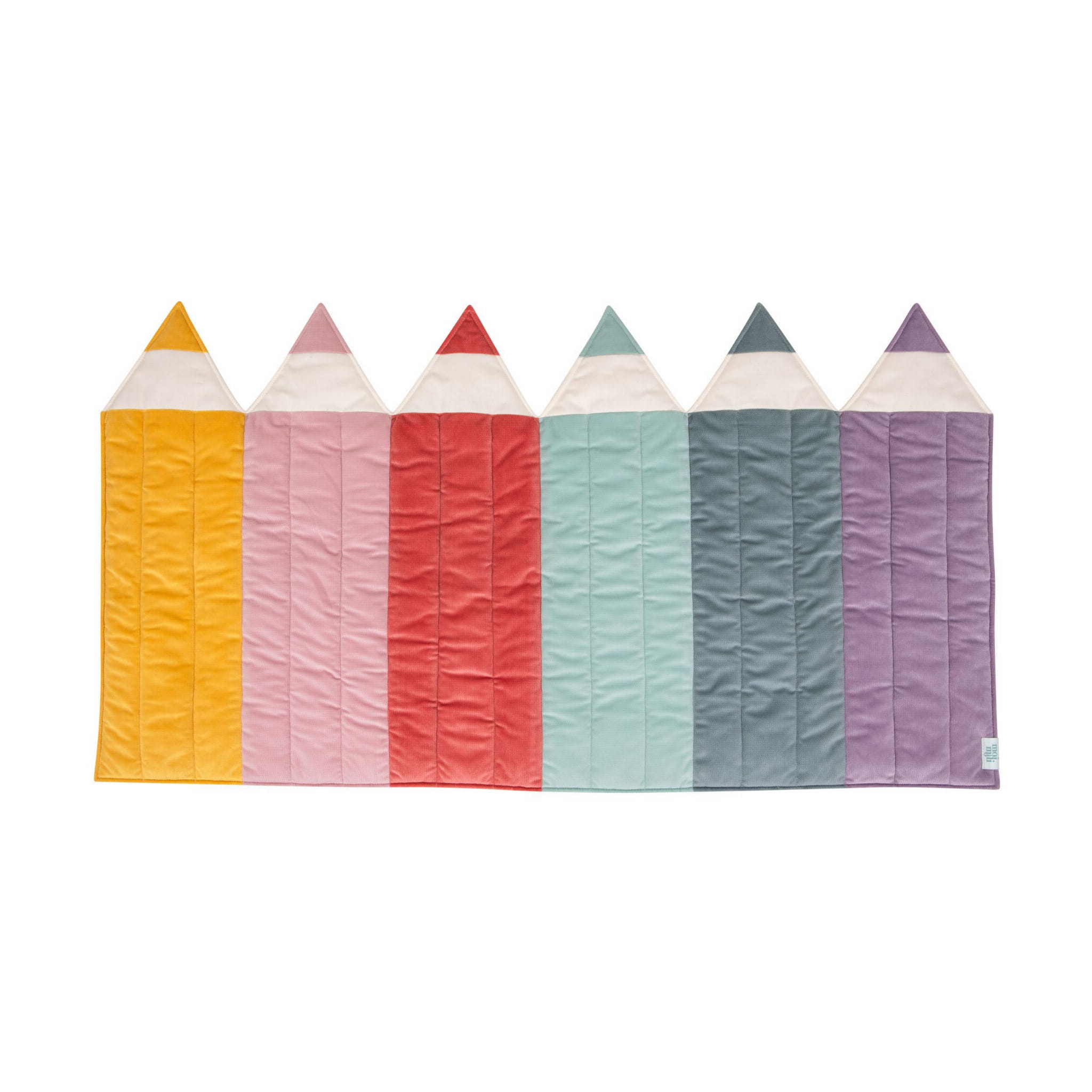 Mata Kredka nie tylko zapewnia wygodną i miękką przestrzeń do zabawy, ale też wspaniale dopełnia wystrój pokoju, stając się centralnym punktem każdej dziecięcej aranżacji. Świetnie sprawdza się jako mata na podłogę, narzuta na łóżko lub pled na pufy, skrzynie i inne meble, nadając im przytulny, kreatywny wygląd.