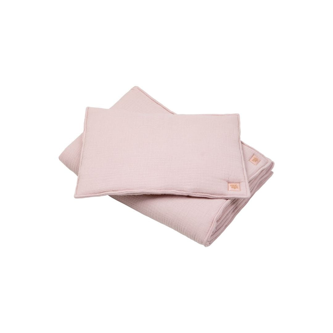 W skład zestawu wchodzi płaska muślinowa poduszka i kołderka.