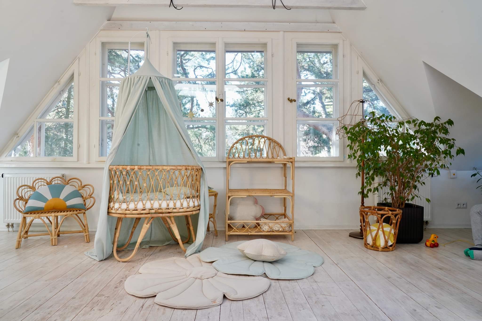 Kolekcja Bloom House to maty do zabawy, ozdobne poduszki oraz girlandy z kwiatowym motywem w delikatnych odcieniach inspirowanych naturalnymi kolorami roślin. Dzięki nim wyczarujesz magiczny klimaty w dziecięcym wnętrzu.
