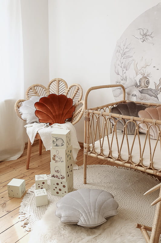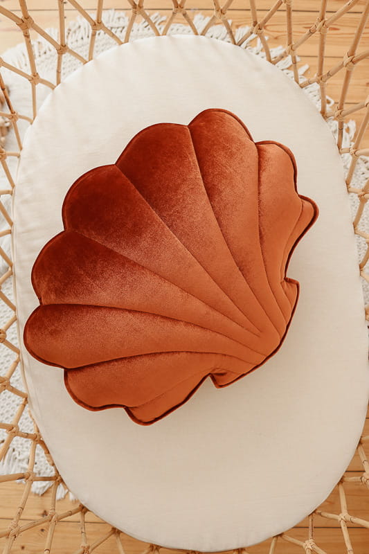 Oryginalne poduszki w kształcie muszli to propozycja na dekorację dziecięcego łóżeczka czy rattanowego fotela. Sprawdzi się również jako puf czy podparcie pleców podczas czytania książki. Ozdobna poduszka będzie super wykończeniem kącika dla dziecka z matą i baldachimem lub uzupełnieniem namiotu tipi.