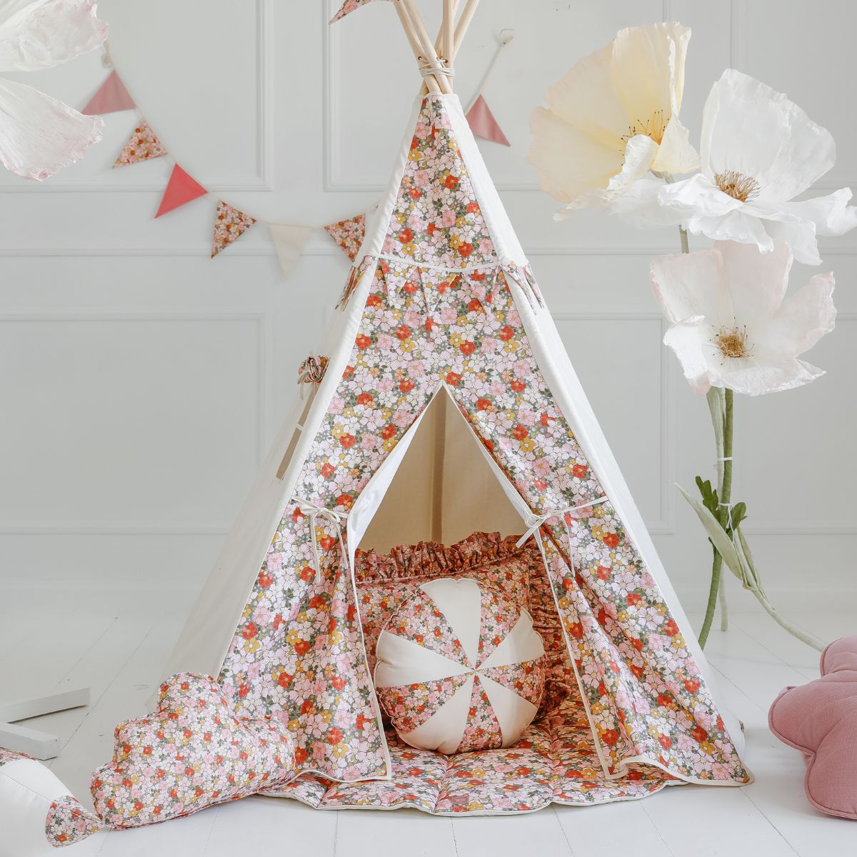 Unikalne tkaniny z kolekcji „Wiosenny Ogród” posłużyły do stworzenia flagowych produktów Moi Mili: namiotów tipi, baldachimów, poduszek z falbanką, poduszek w kształcie serca oraz poduszek kredek. Każdy element kolekcji tworzy harmonijną, spójną całość, dzięki której z łatwością zaaranżujesz piękną przestrzeń w pokoju dziecka.