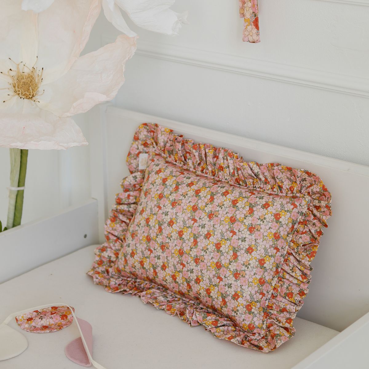 Dekoracyjna poduszka z falbanką w kwiaty – romantyczny, wiosenny akcent do pokoju dziecka i wnętrz w całym domu