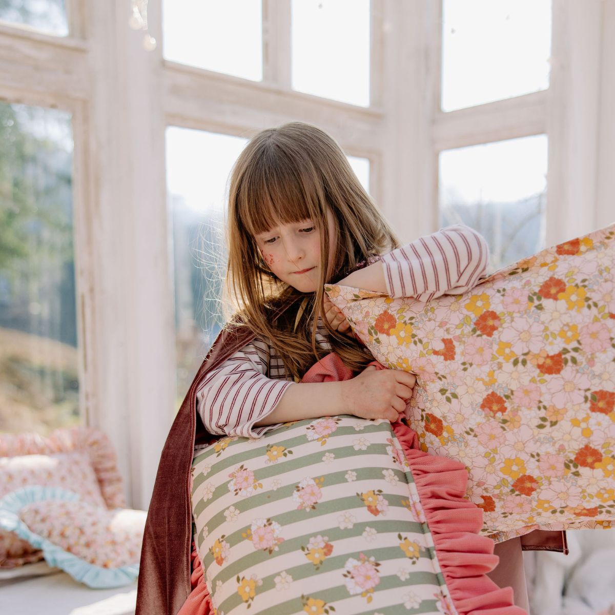 Oryginalne poduszki Moi Mili z autorskim, kwiatowym wzorem to wyjątkowa propozycja dekoracyjna, która odmieni wygląd dziecięcego pokoju. Kwiatowy wzór nadaje wnętrzu delikatności, lekkości i naturalnego uroku, idealnie wpisując się w estetykę pokoju dziewczynki. Poduszka w kwiaty pięknie prezentuje się na dziecięcym łóżeczku, rattanowym fotelu czy w kąciku zabaw, dodając przestrzeni przytulnego charakteru.