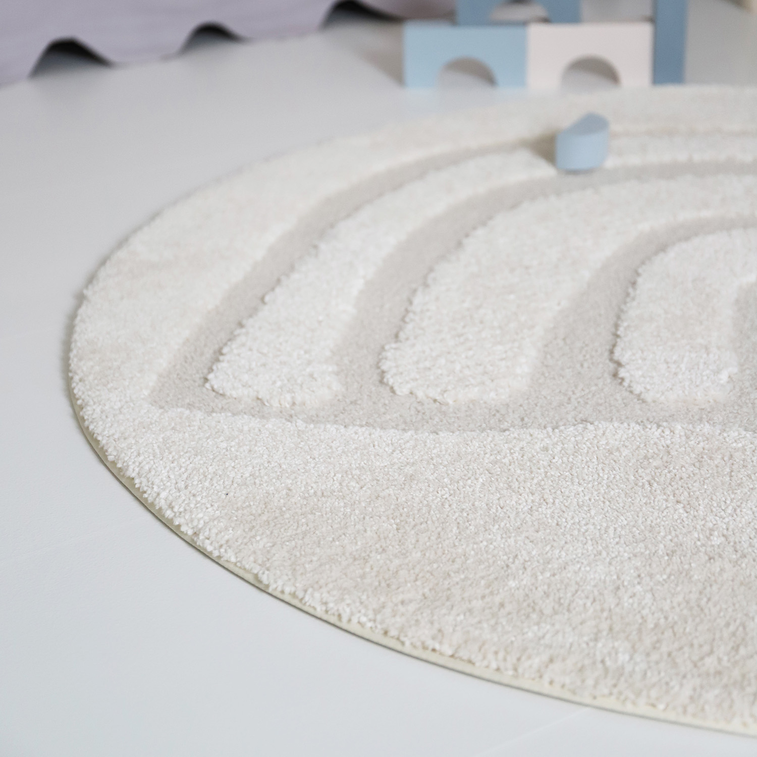 Delikatny kolor w stylu boho pozwalają łatwo dopasować dywan do różnych aranżacji wnętrz, nadając przestrzeni lekkości i harmonii. Materiał dywanu jest łatwy w utrzymaniu w czystości, co jest praktyczne w codziennym użytkowaniu w pokoju dziecięcym.