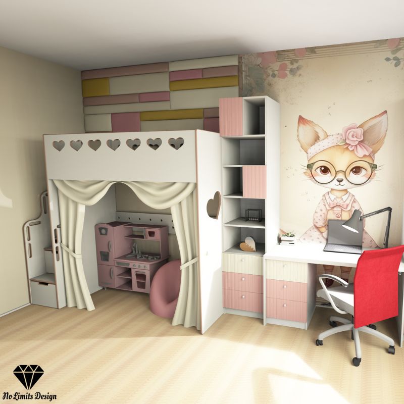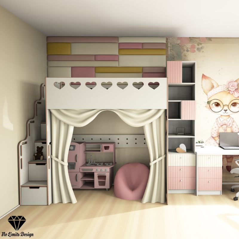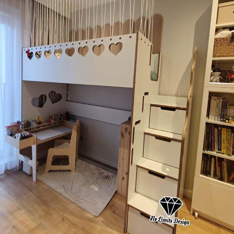 Białe łóżko dziecięce na antresoli Corazon marki No Limits Design to idealny wybór do pokoju dziewczynki. Uroczy motyw serduszek nadaje wnętrzu wyjątkowego charakteru, łącząc bajkowy styl z nowoczesnym designem. Łóżko zapewnia wygodne i bezpieczne miejsce do snu na górnym poziomie, a dolną przestrzeń można wykorzystać jako strefę zabawy, nauki lub relaksu. Stabilne schody umożliwiają bezpieczne i komfortowe wejście, dzięki czemu łóżko doskonale sprawdzi się nawet dla młodszych dzieci.