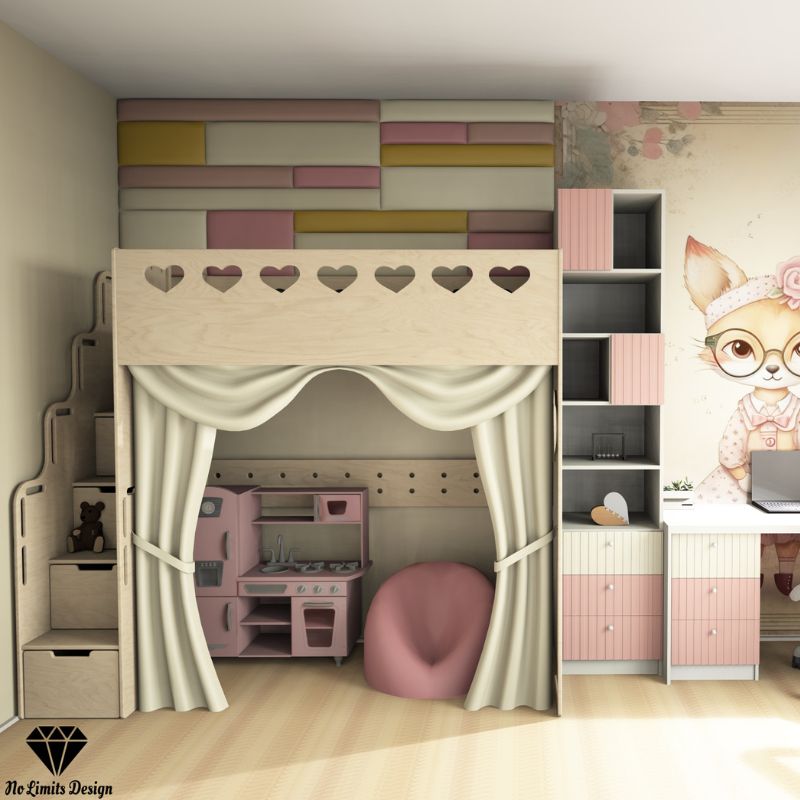 Łóżko dziecięce na antresoli Corazon marki No Limits Design to idealny wybór do pokoju dziewczynki. Uroczy motyw serduszek nadaje wnętrzu wyjątkowego charakteru, łącząc bajkowy styl z nowoczesnym designem. Łóżko zapewnia wygodne i bezpieczne miejsce do snu na górnym poziomie, a dolną przestrzeń można wykorzystać jako strefę zabawy, nauki lub relaksu. Stabilne schody umożliwiają bezpieczne i komfortowe wejście, dzięki czemu łóżko doskonale sprawdzi się nawet dla młodszych dzieci.