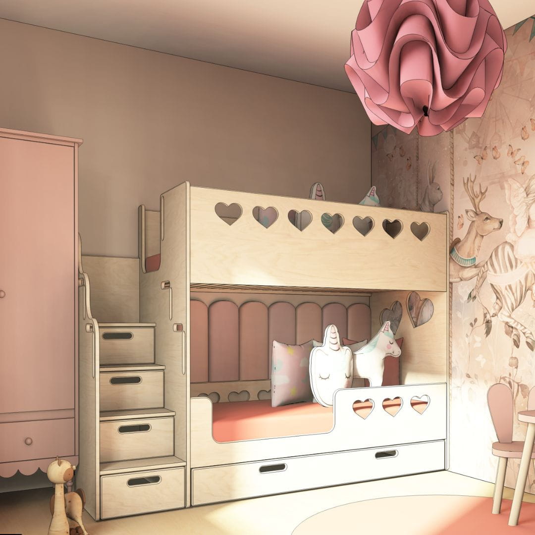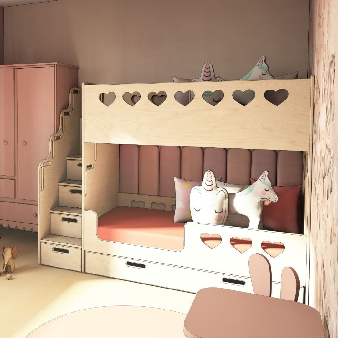 Drewniane łóżko piętrowe do pokoju rodzeństwa polskiej marki No Limits Design to model łóżka o nowoczesnym designie. Zapewni wygodne miejsce do snu, ale także stworzy przyjemną atmosferę w pokoju rodzeństwa. Ciekawy design sprawi, że Twoje dzieci będą chętniej zasypiały w swoim łóżeczku. Łóżko piętrowe dla dziewczynek z serduszkami to rozwiązanie bezpieczne, ale też atrakcyjne i funkcjonalne.