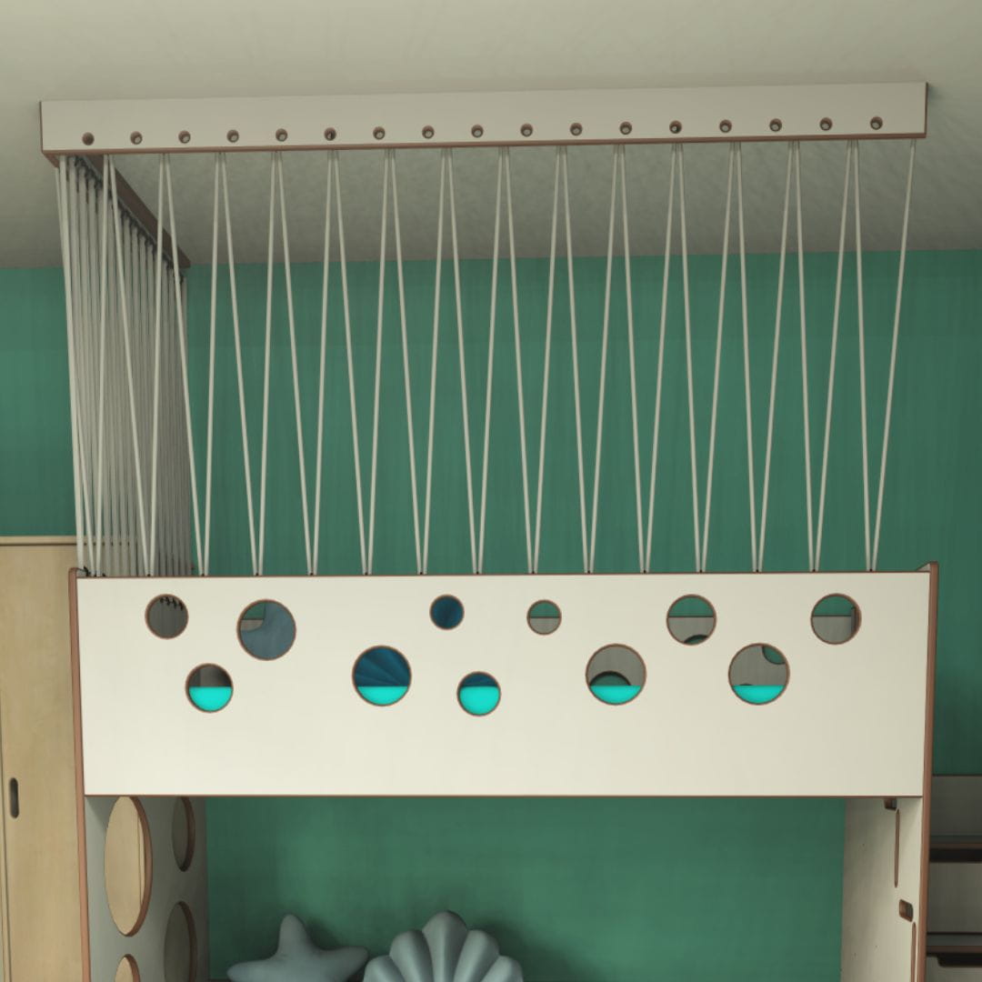 Dla dodatkowego bezpieczeństwa łóżka piętrowego oferujemy opcję dodatkowej szyny montowanej do sufitu, która zwiększa zabezpieczenie dla dziecka śpiącego na górnej kondygnacji. Szyna stanowi solidne mocowanie, do którego można przywiązać sznurek, aby stworzyć delikatne barierki lub przywiesić dekoracyjne tkaniny, co zapewnia nie tylko bezpieczeństwo, ale i przytulną atmosferę. Należy pamiętać, że sznurek mocowany do szyny nie jest częścią zestawu i należy dokupić go osobno, dopasowując do indywidualnych potrzeb.