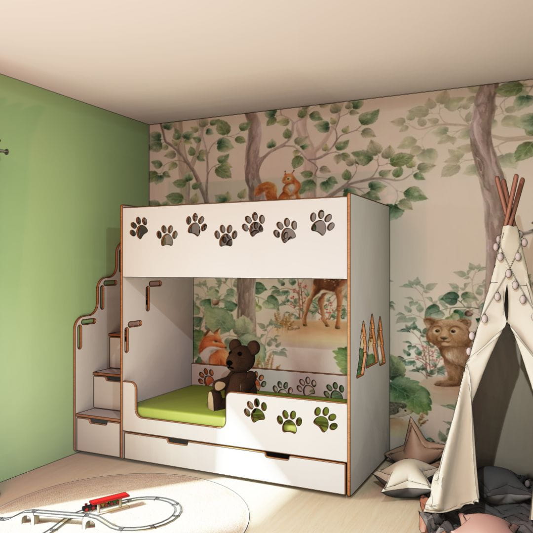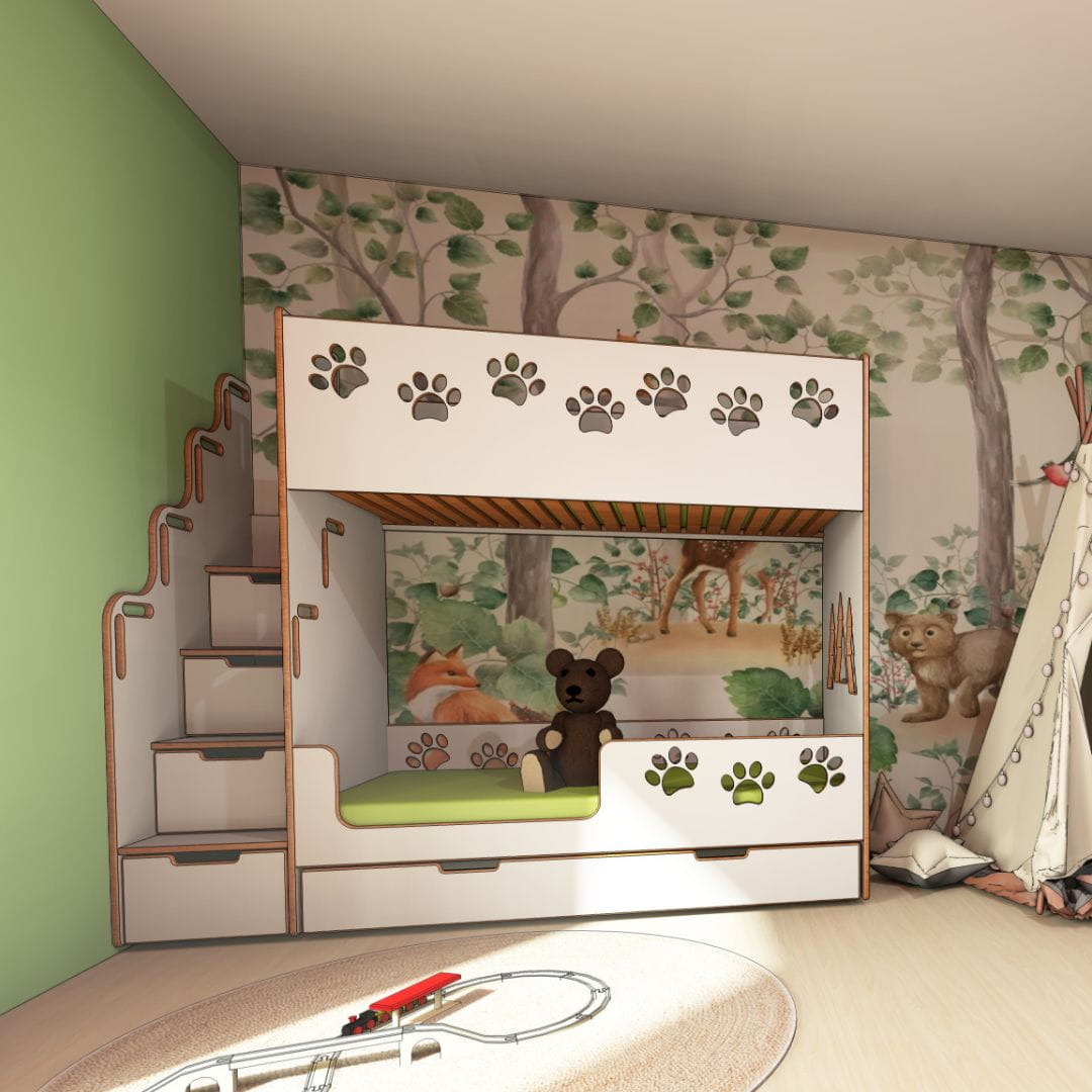 Białe łóżko piętrowe do pokoju rodzeństwa polskiej marki No Limits Design to model łóżka o nowoczesnym designie. Zapewni wygodne miejsce do snu, ale także stworzy przyjemną atmosferę w pokoju rodzeństwa. Ciekawy design sprawi, że Twoje dzieci będą chętniej zasypiały w swoim łóżeczku. Łóżko piętrowe dla dzieci z motywem leśnym to rozwiązanie bezpieczne, ale też atrakcyjne i funkcjonalne.