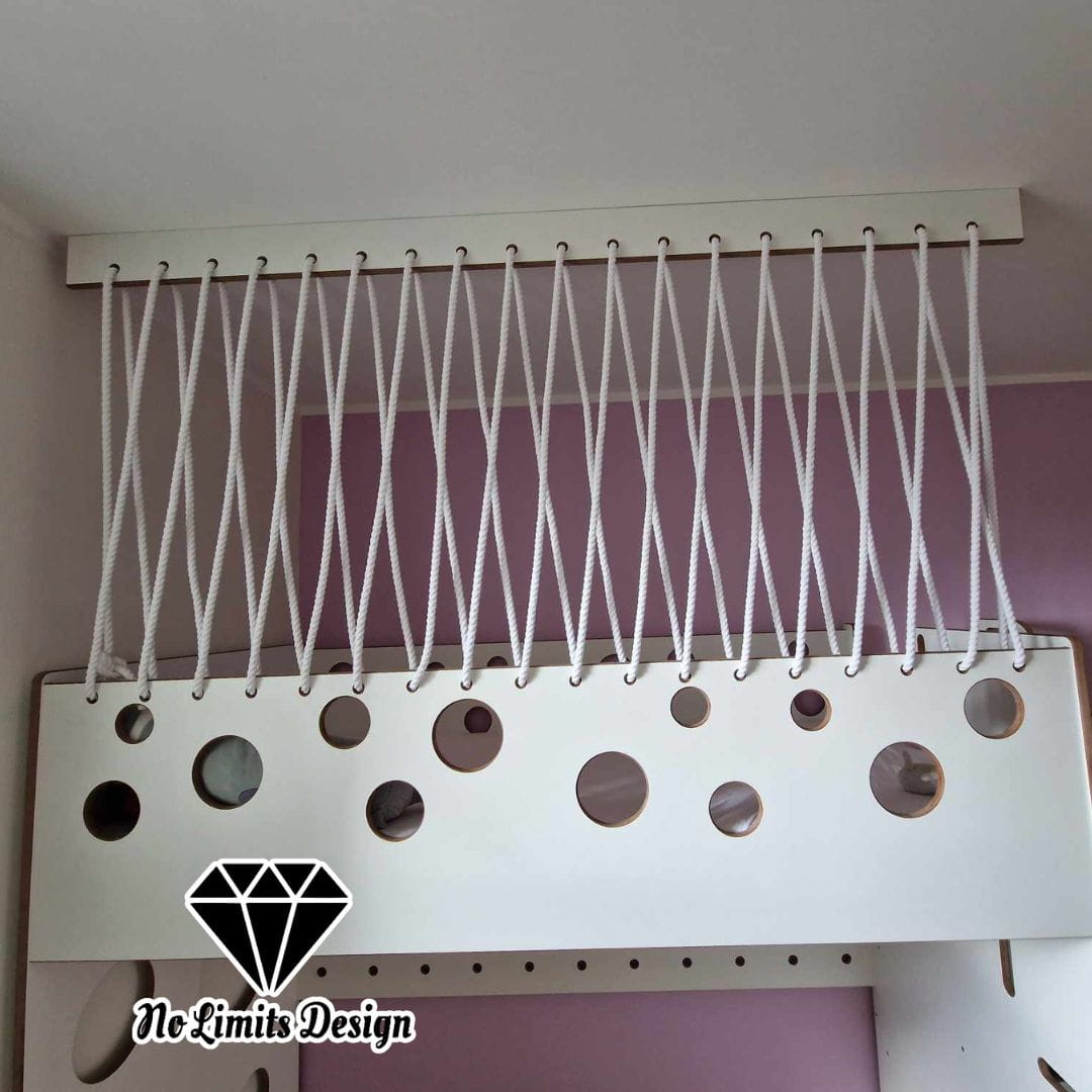 Dla dodatkowego bezpieczeństwa łóżka piętrowego oferujemy opcję dodatkowej szyny montowanej do sufitu, która zwiększa zabezpieczenie dla dziecka śpiącego na górnej kondygnacji. Szyna stanowi solidne mocowanie, do którego można przywiązać sznurek, aby stworzyć delikatne barierki lub przywiesić dekoracyjne tkaniny, co zapewnia nie tylko bezpieczeństwo, ale i przytulną atmosferę. Należy pamiętać, że sznurek mocowany do szyny nie jest częścią zestawu i należy dokupić go osobno, dopasowując do indywidualnych potrzeb.