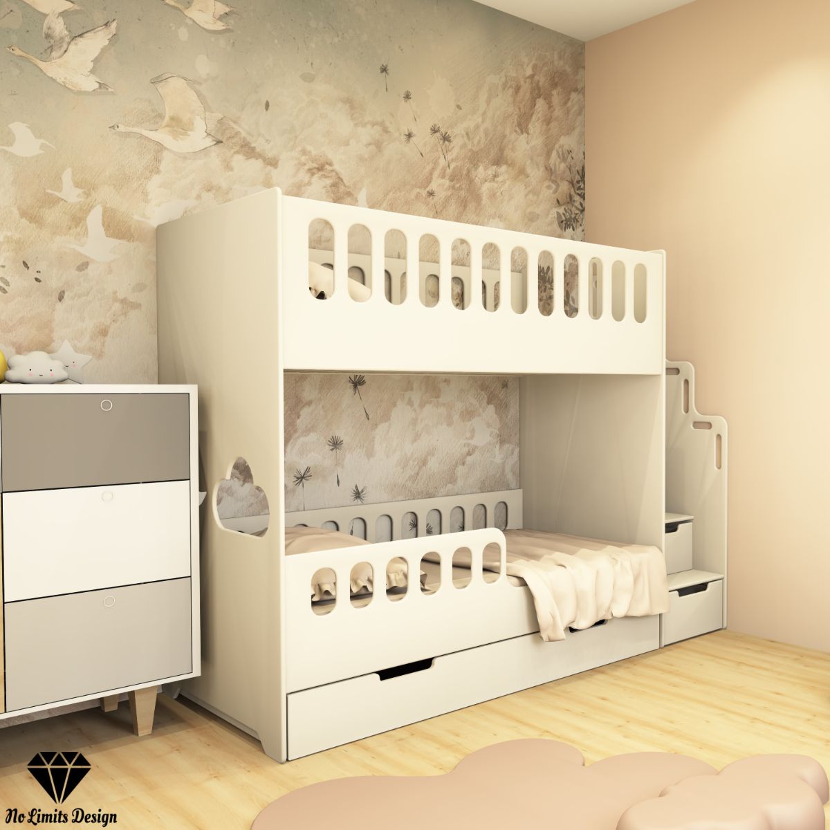 Białe łóżko piętrowe do pokoju rodzeństwa polskiej marki No Limits Design to model łóżka o nowoczesnym designie. Zapewni wygodne miejsce do snu, ale także stworzy przyjemną atmosferę w pokoju rodzeństwa. Ciekawy design sprawi, że Twoje dzieci będą chętniej zasypiały w swoim łóżeczku. Łóżko piętrowe dla dzieci ze schodkami to rozwiązanie bezpieczne, ale też atrakcyjne i funkcjonalne.