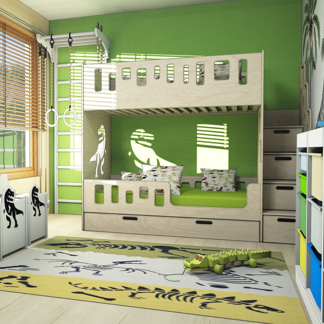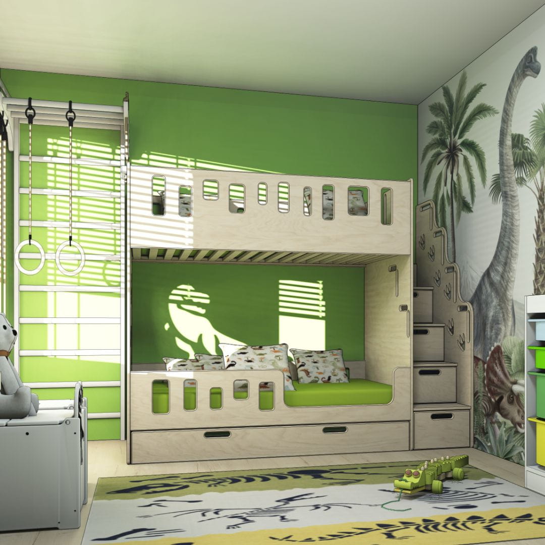 Drewniane łóżko piętrowe do pokoju rodzeństwa polskiej marki No Limits Design to model łóżka o nowoczesnym designie. Zapewni wygodne miejsce do snu, ale także stworzy przyjemną atmosferę w pokoju rodzeństwa. Ciekawy design sprawi, że Twoje dzieci będą chętniej zasypiały w swoim łóżeczku. Łóżko piętrowe dla dzieci z motywem dinozaura to rozwiązanie bezpieczne, ale też atrakcyjne i funkcjonalne.