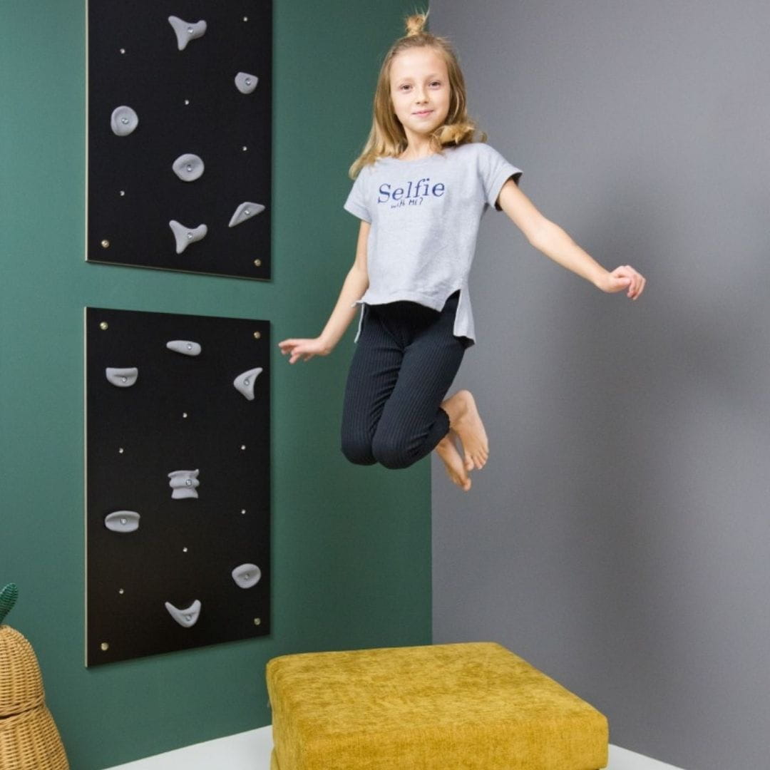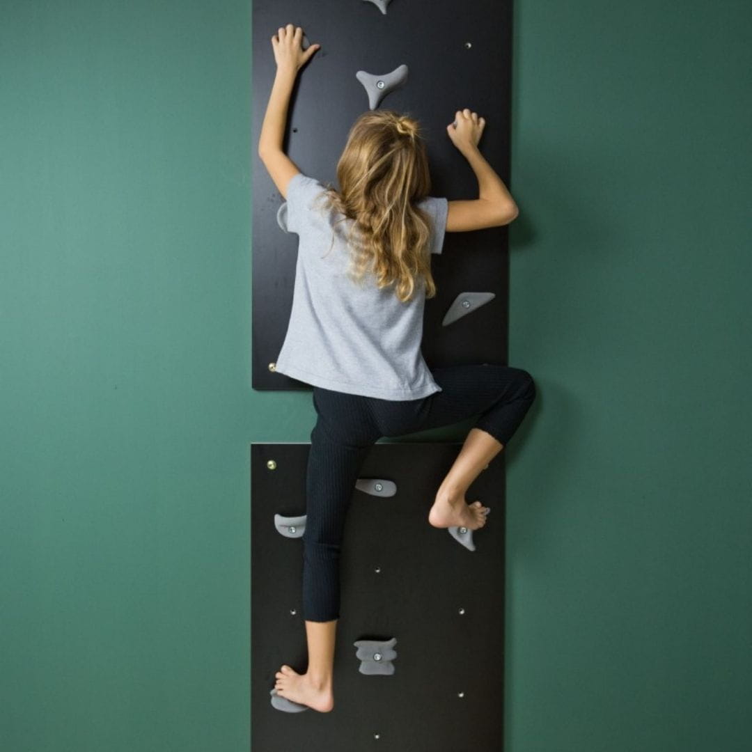 Łącząc ze sobą kilka modułów ścianki możesz zamienić przestrzeń Twojego dziecka w pole nieskończonych manewrów i akrobacji. Dowolne konfiguracje w pionie czy poziomie pozwalają na elastyczne dopasowanie układu modułów do Twojego wnętrza. Moduł domowej ścianki wspinaczkowej NUKI został wykonany ze sklejki brzozowej pokrytej odpornym na zarysowania laminatem w kolorze czarnym.