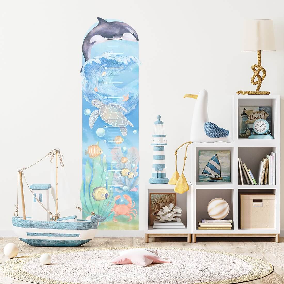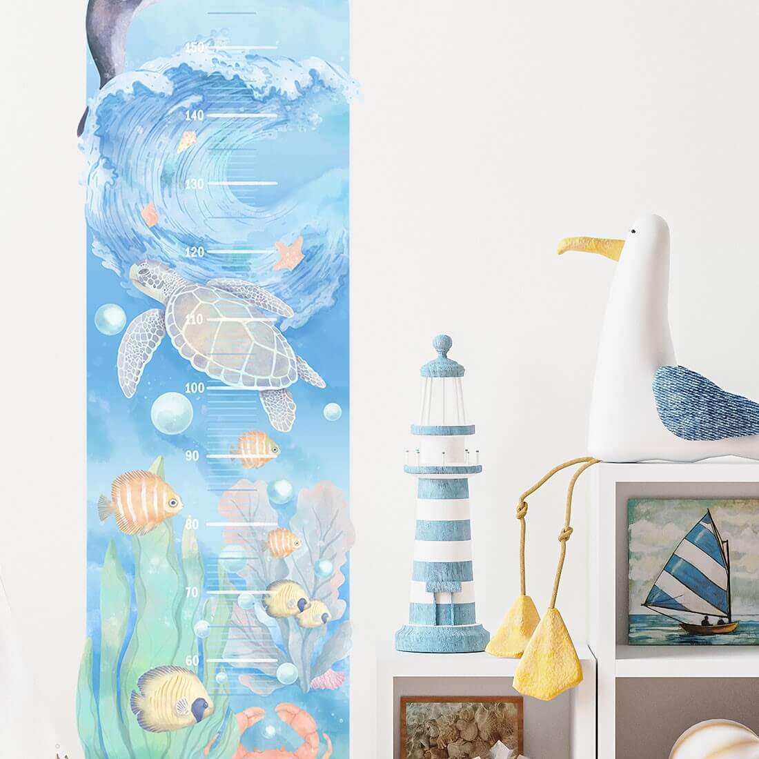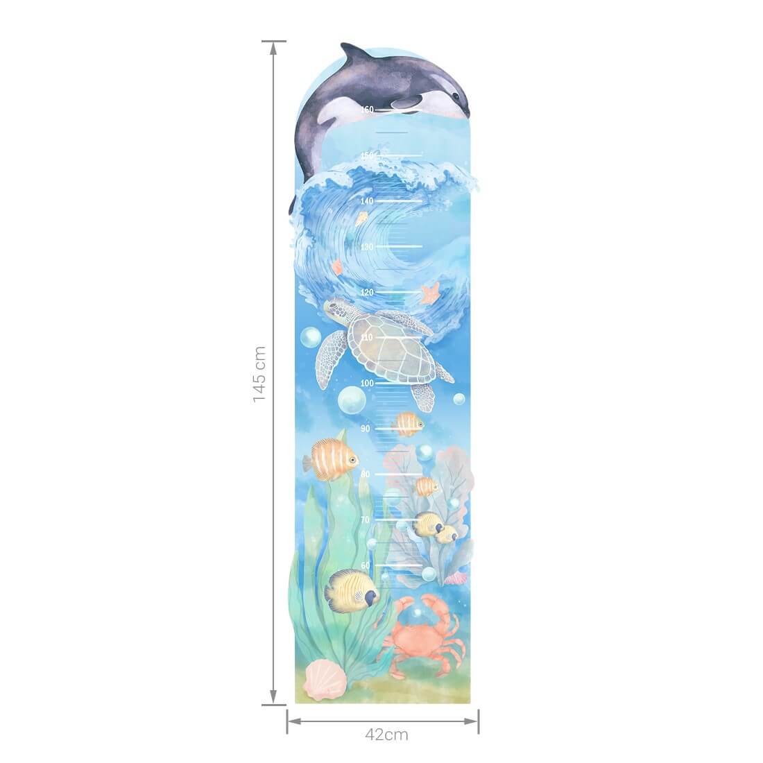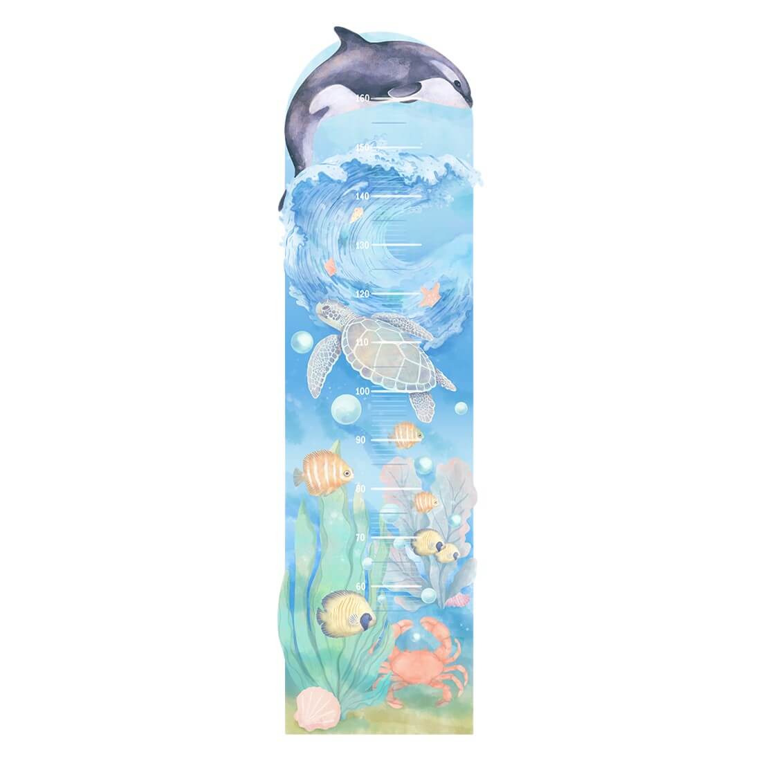 Kolekcja Podwodny świat to piękne, morskie widoki i oceaniczne głębie pełne ryb, wodorostów, krabów i muszli. Naklejka miarka wzrostu z pewnością przypadnie do gusty każdemu miłośnikowi życia tętniącego pod taflą wody. Cała seria naklejek na ścianę została zaprojektowana tak, aby idealnie ze sobą współgrała i tworzyła spójną kompozycję.