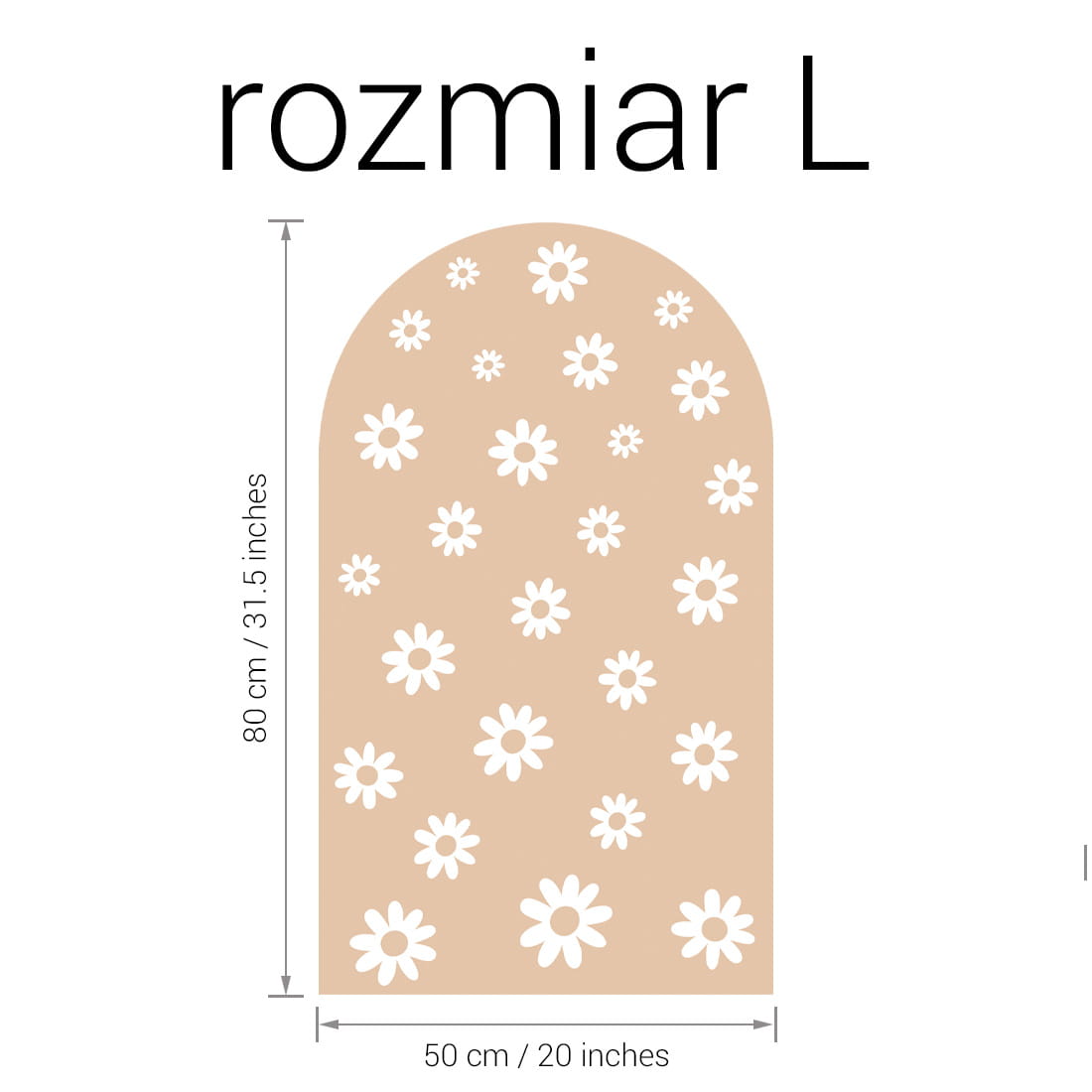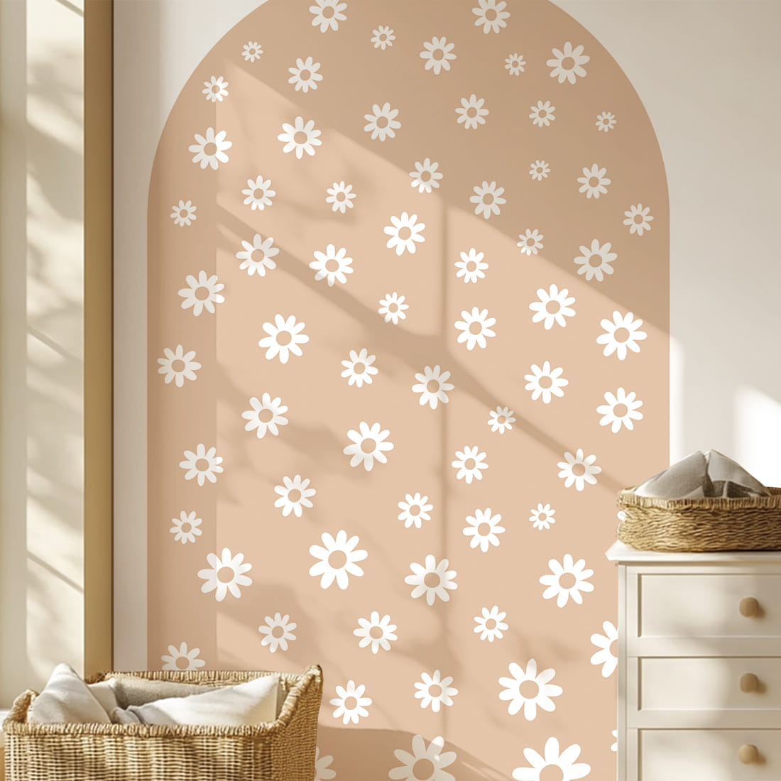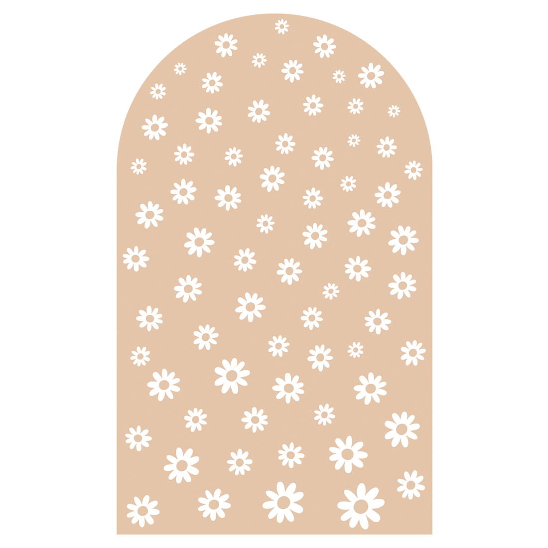 Naklejka ścienna w kształcie łuku Stokrotki to wyjątkowa dekoracja, która łączy subtelność natury z modnym, neutralnym kolorem. Utrzymana w ciepłym odcieniu beżu i ozdobiona delikatnym wzorem białych stokrotek w różnych rozmiarach, wprowadza do dziecięcego wnętrza naturalność, harmonię i spokój.