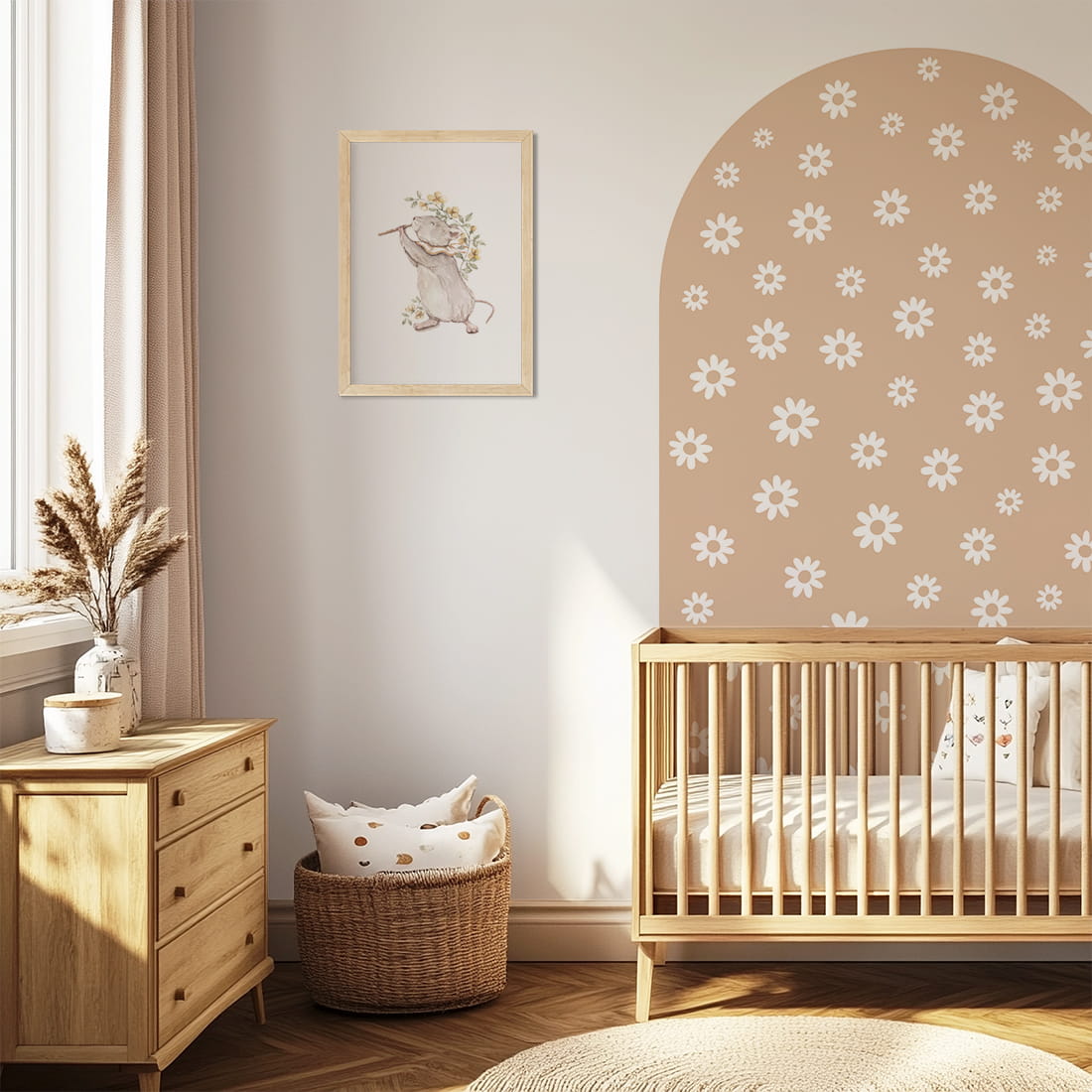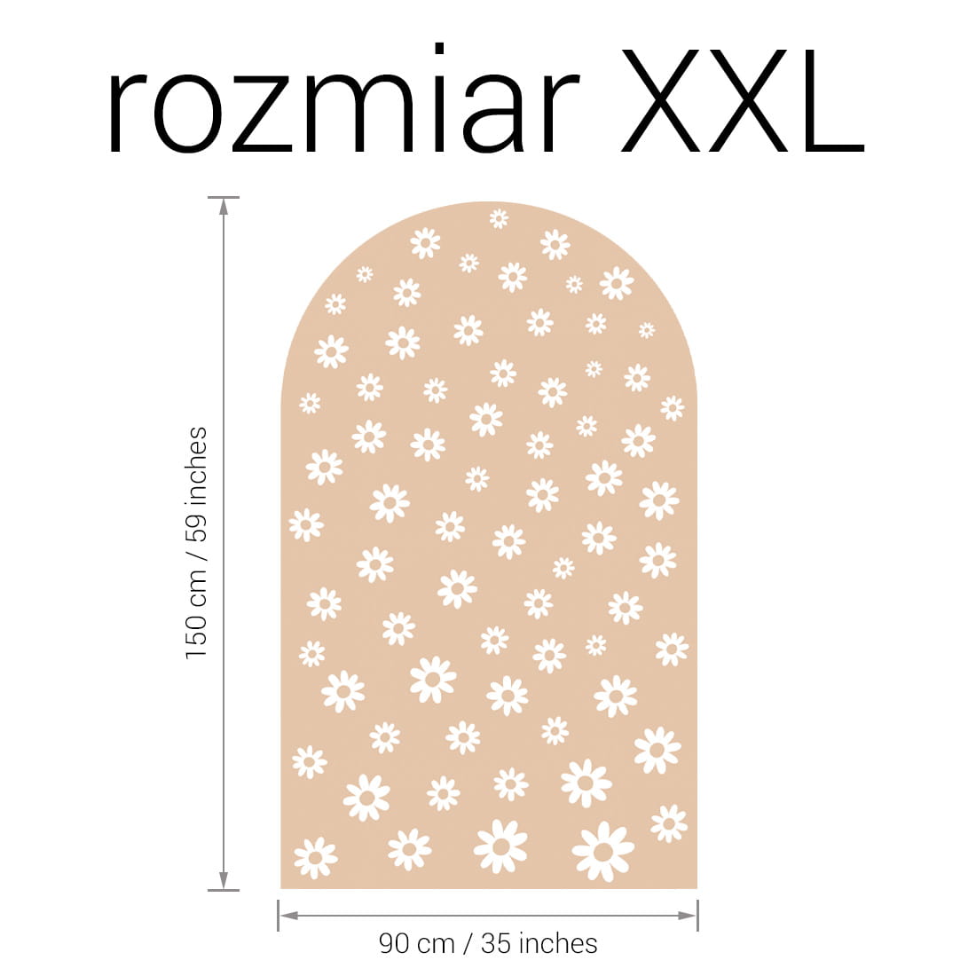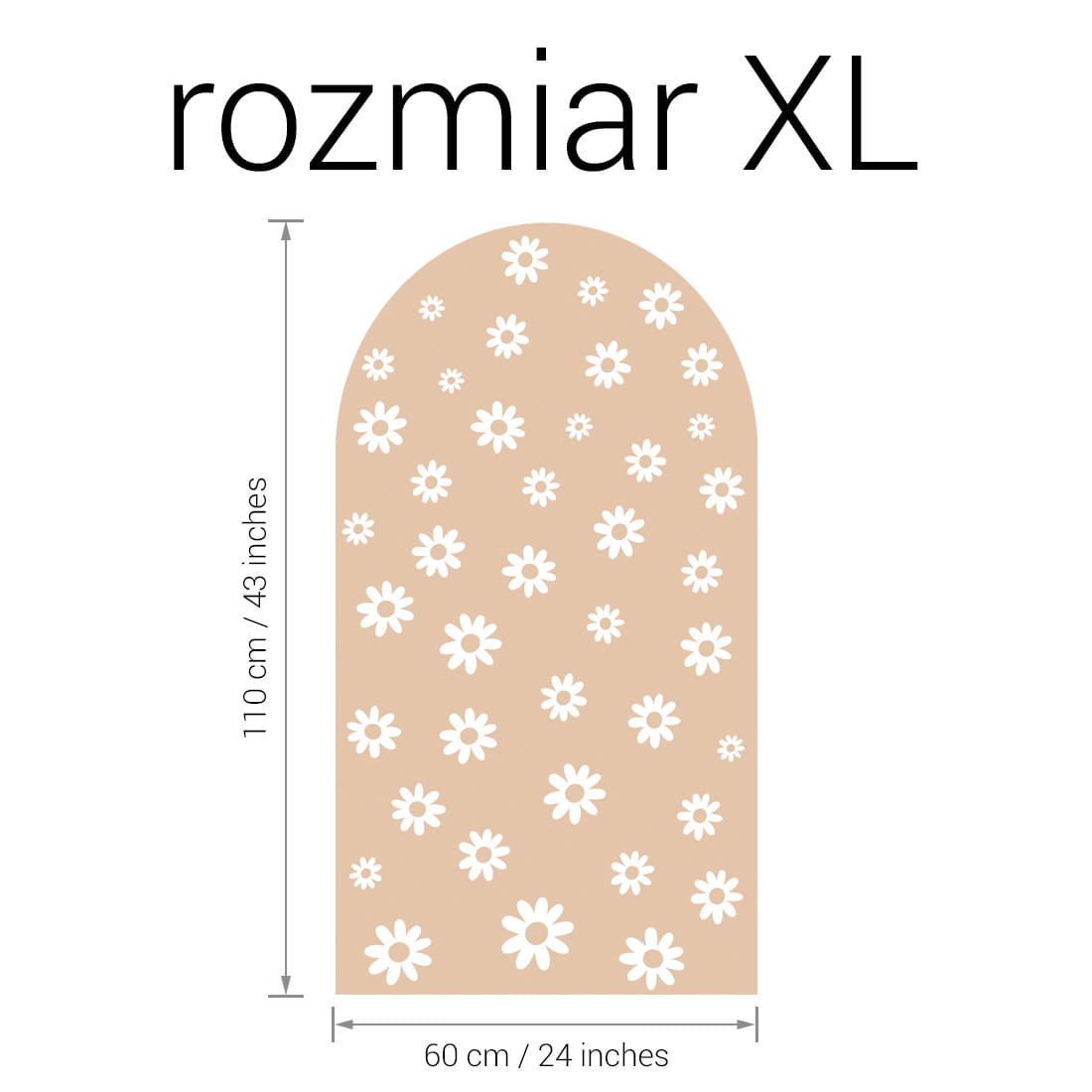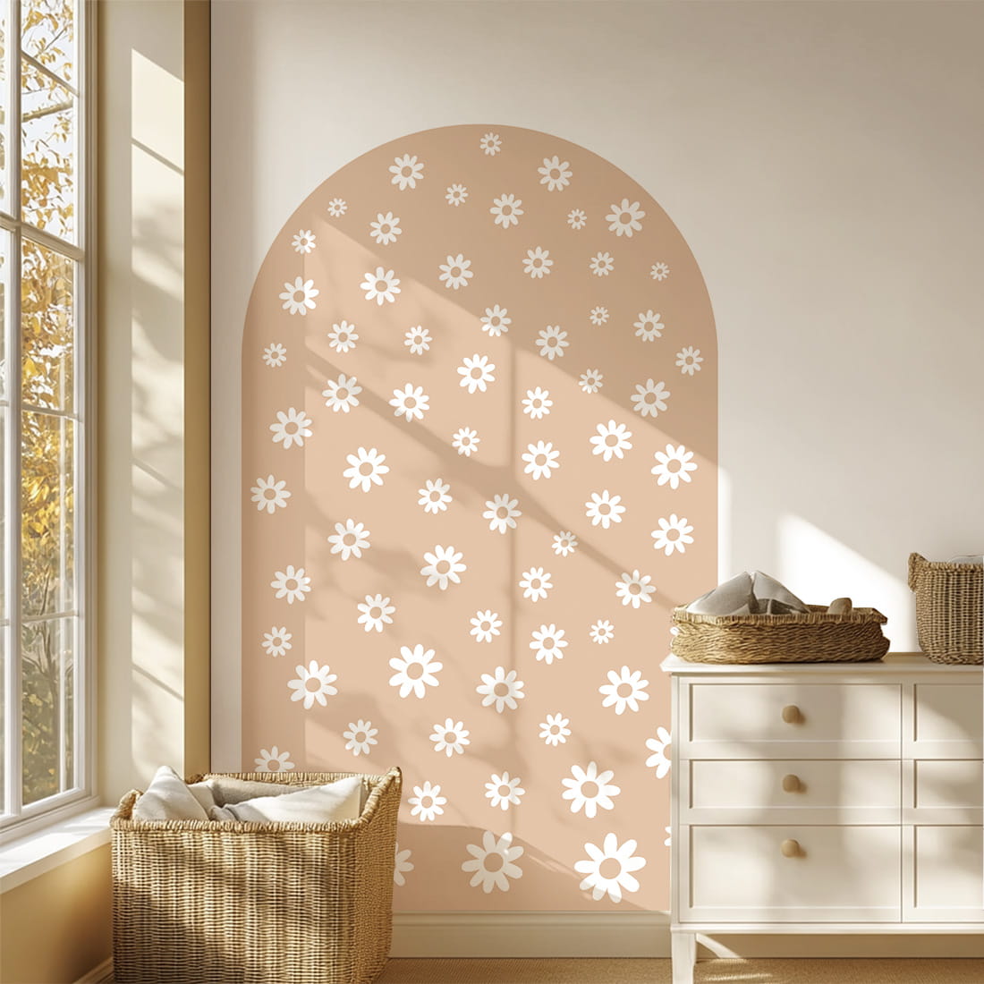 Naklejka ścienna w kształcie łuku Stokrotki to wyjątkowa dekoracja, która łączy subtelność natury z modnym, neutralnym kolorem. Utrzymana w ciepłym odcieniu beżu i ozdobiona delikatnym wzorem białych stokrotek w różnych rozmiarach, wprowadza do dziecięcego wnętrza naturalność, harmonię i spokój.