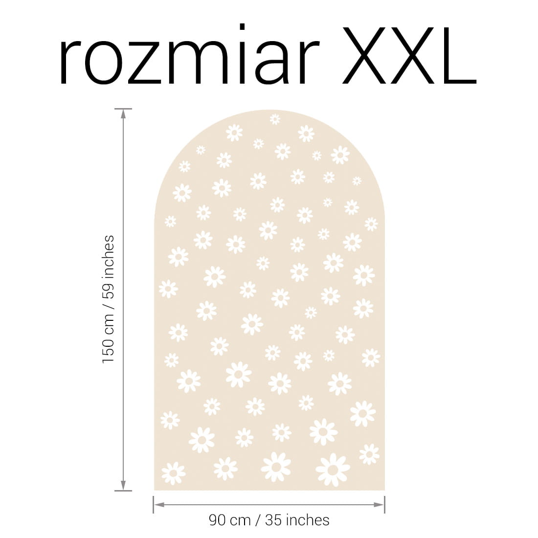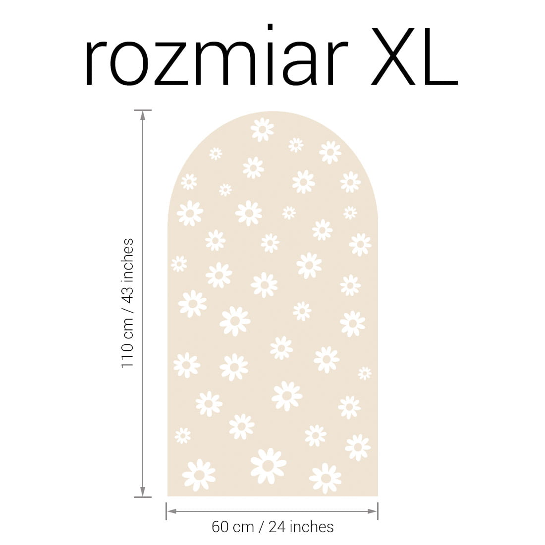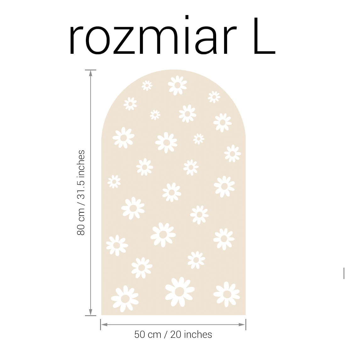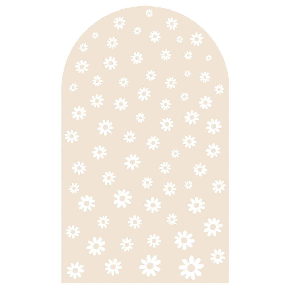 Naklejka ścienna w kształcie łuku latte stokrotki mix to harmonijna kompozycja, która łączy naturalny odcień mlecznego beżu z białymi stokrotkami w różnych rozmiarach. Zestawienie drobnych i większych kwiatów tworzy efekt lekkości i przestrzennej głębi, wprowadzając do pokoju dziecka spokój, świeżość i subtelną elegancję.