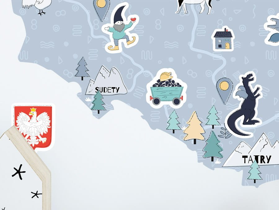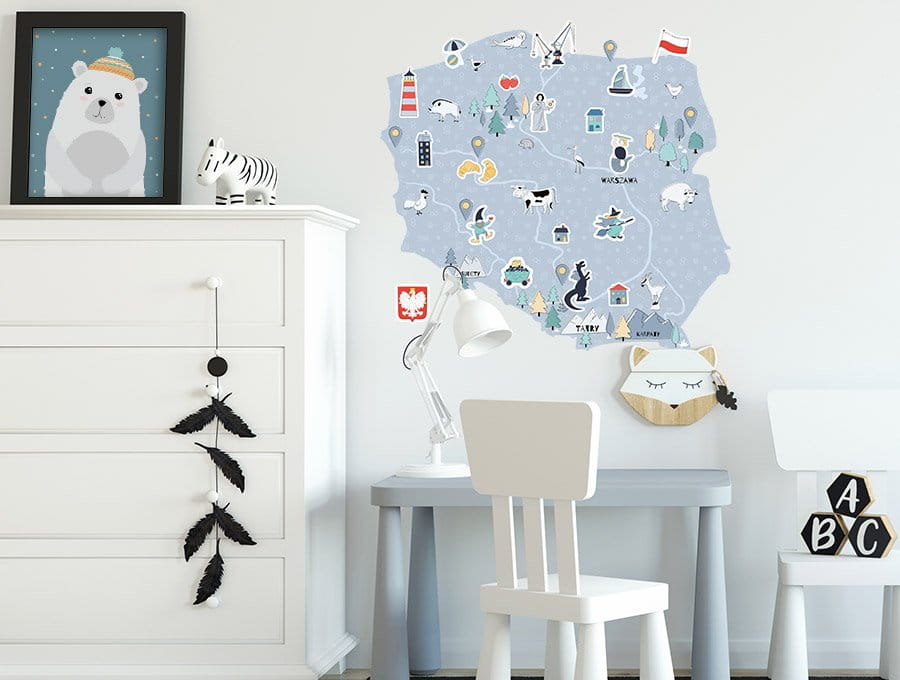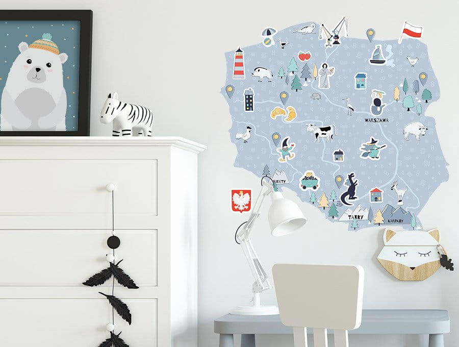 Naklejka na ścianę do pokoju dziecka mapa Polski będzie doskonałym elementem edukacyjnym i dekoracyjnym. Dzięki niej najmłodsi mają możliwość poznania poszczególnych regionów naszego kraju, jednocześnie ucząc się o ich tradycjach i zwyczajach.