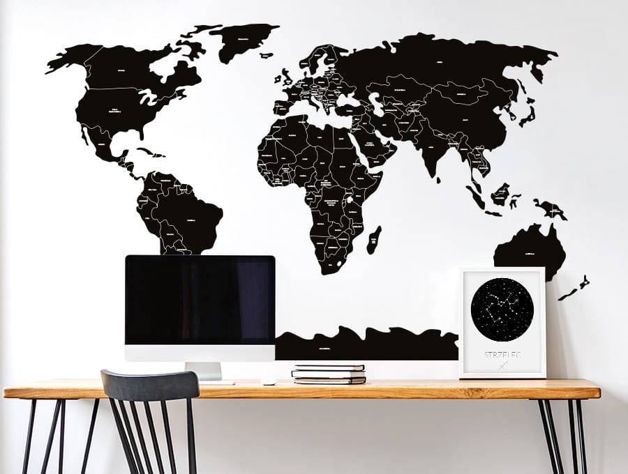 Czarna naklejka do pokoju dziecka mapa świata dostępna jest w 2 rozmiarach: