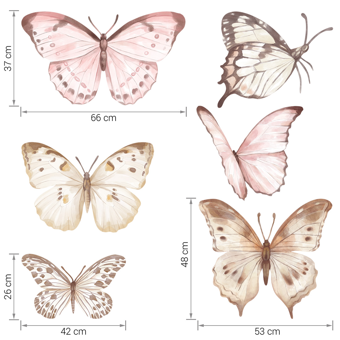 Dodaj wnętrzu lekkości i romantycznego uroku! Naklejki na ścianę Motyle duże w delikatnych odcieniach różu i beżu to wyjątkowa ozdoba, która wprowadzi do pokoju dziecka harmonię, spokój i przytulny klimat. Ręcznie malowane motyle wyglądają jakby unosiły się w powietrzu, tworząc piękną, naturalną kompozycję na ścianie.