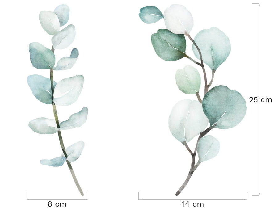 Naklejki ścienne eukaliptus są zabezpieczone specjalnym matowym laminatem, który chroni je przed zarysowaniami podczas codziennego użytkowania, a dodatkowo ułatwia naklejanie - folia jest grubsza i łatwiej się ją przenosi na ścianę. Naklejki na ścianę nie posiadają tła - wycięte są po obrysie, co oznacza, że można przykleić je na ścianie w dowolnym kolorze.