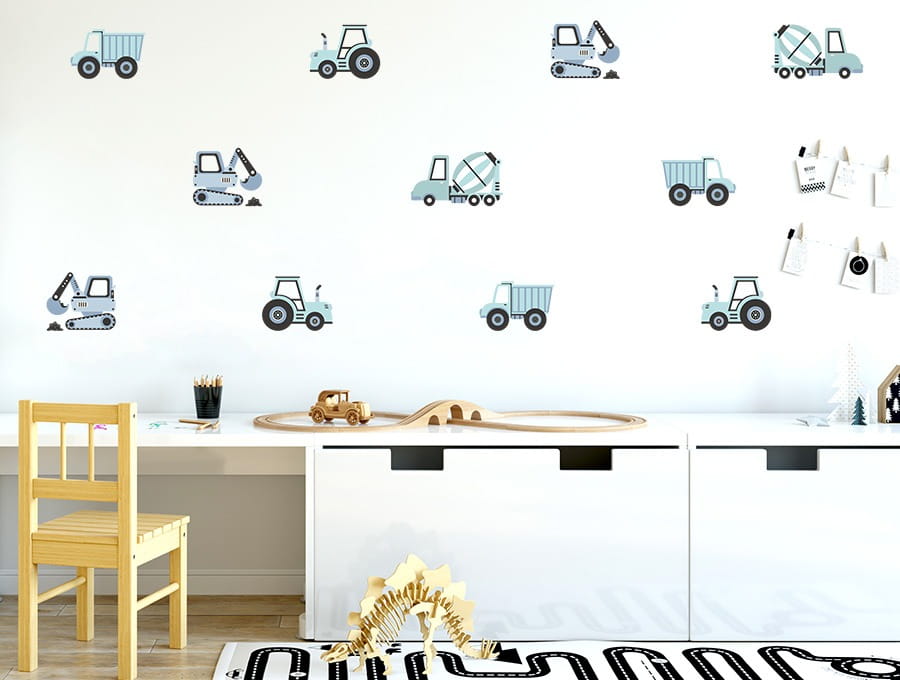 Naklejki na ścianę budowa Pastelowe Love pozwalają na dowolną aranżację kącika dla chłopca. Dziecko samo może zdecydować, w którym miejscu przykleić swoje ulubione pojazdy.