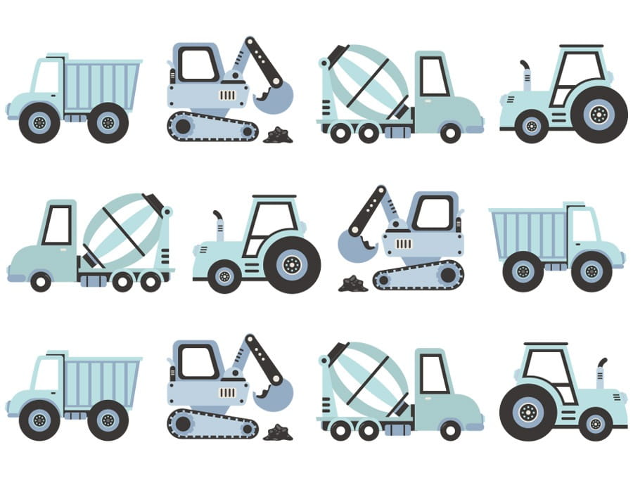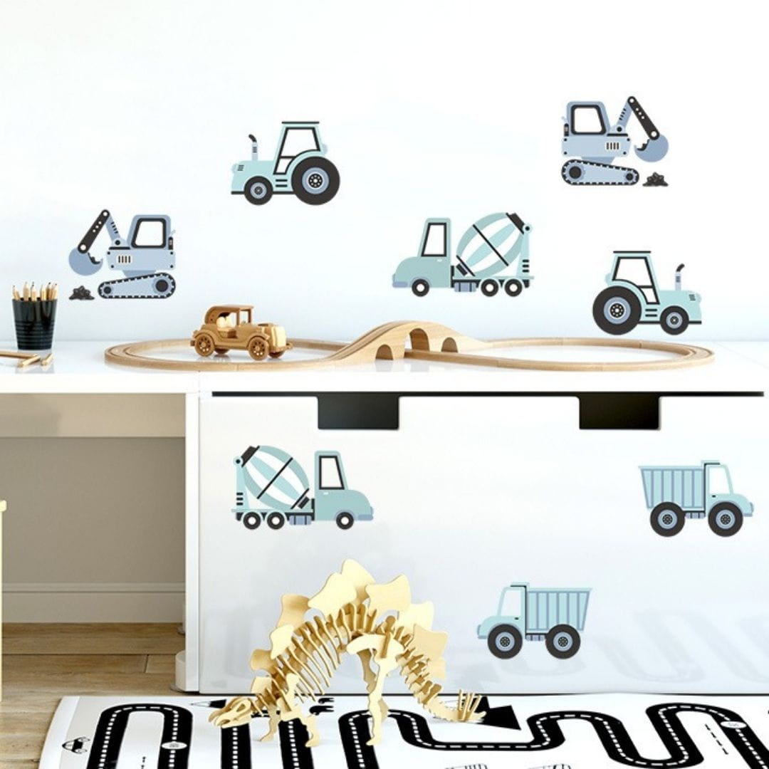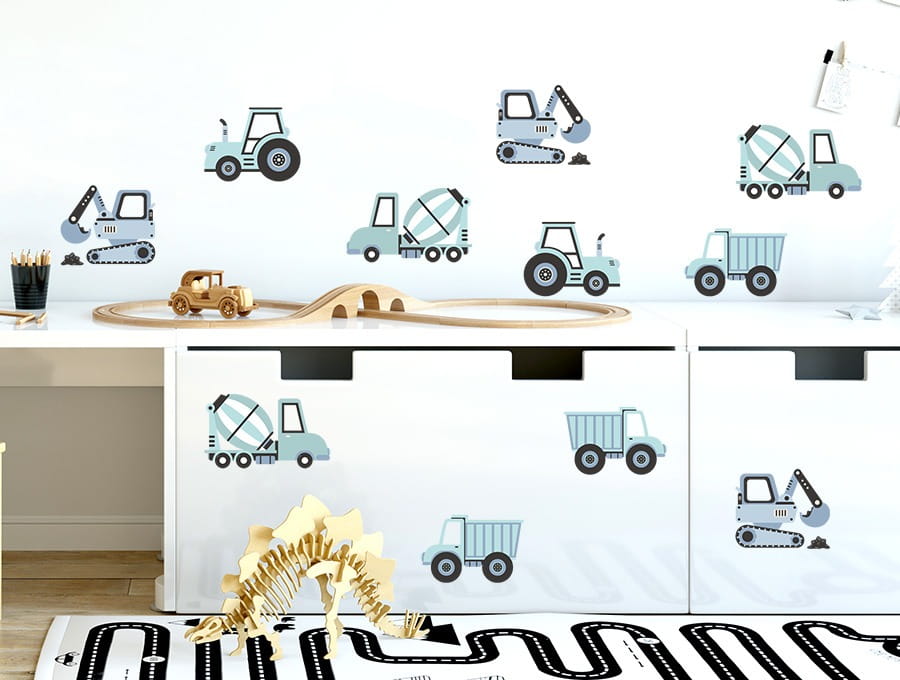 Zamień pokój dziecka w prawdziwy plac budowy, dzięki serii naklejek, w których skład wchodzą: koparki, betoniarki, traktory i wywrotki.