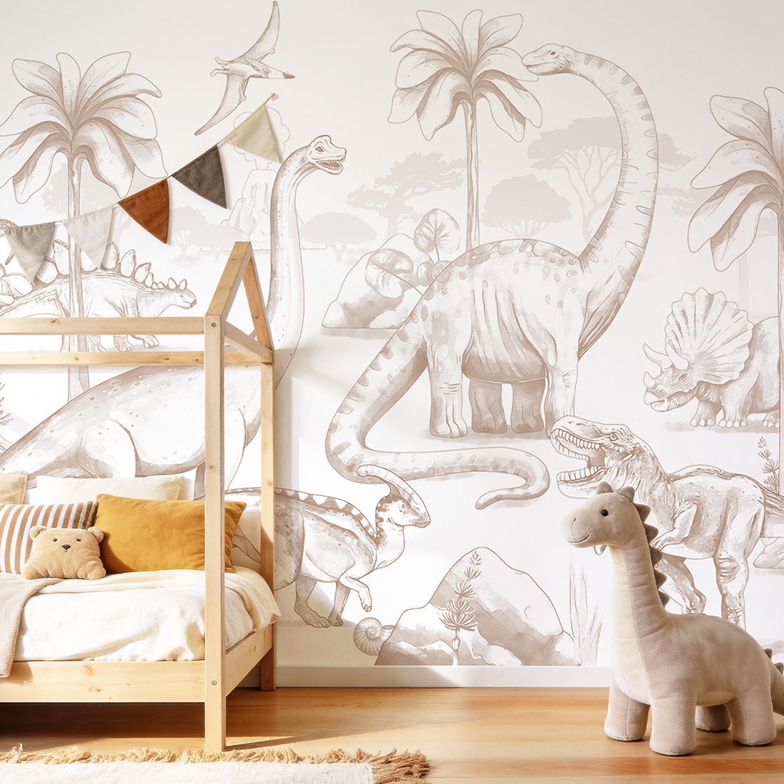 Tapeta Dinozaury Sepia to prawdziwa gratka dla fanów stylu eko i skandynawskiego. Dzięki swojej neutralności, tworzy ona fenomenalne tło dla elementów wyposażenia wykonanych z surowców wtórnych i naturalnych.