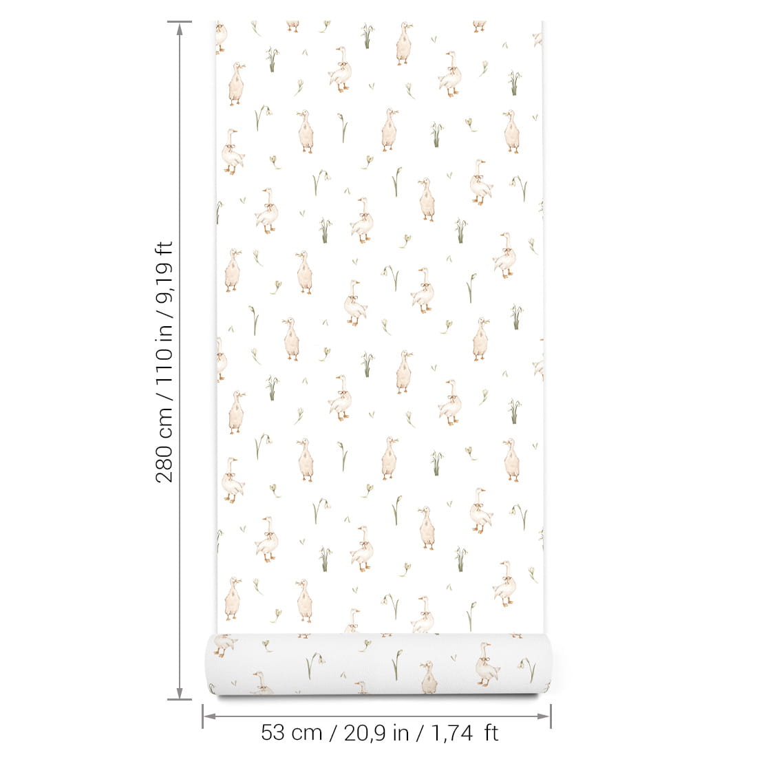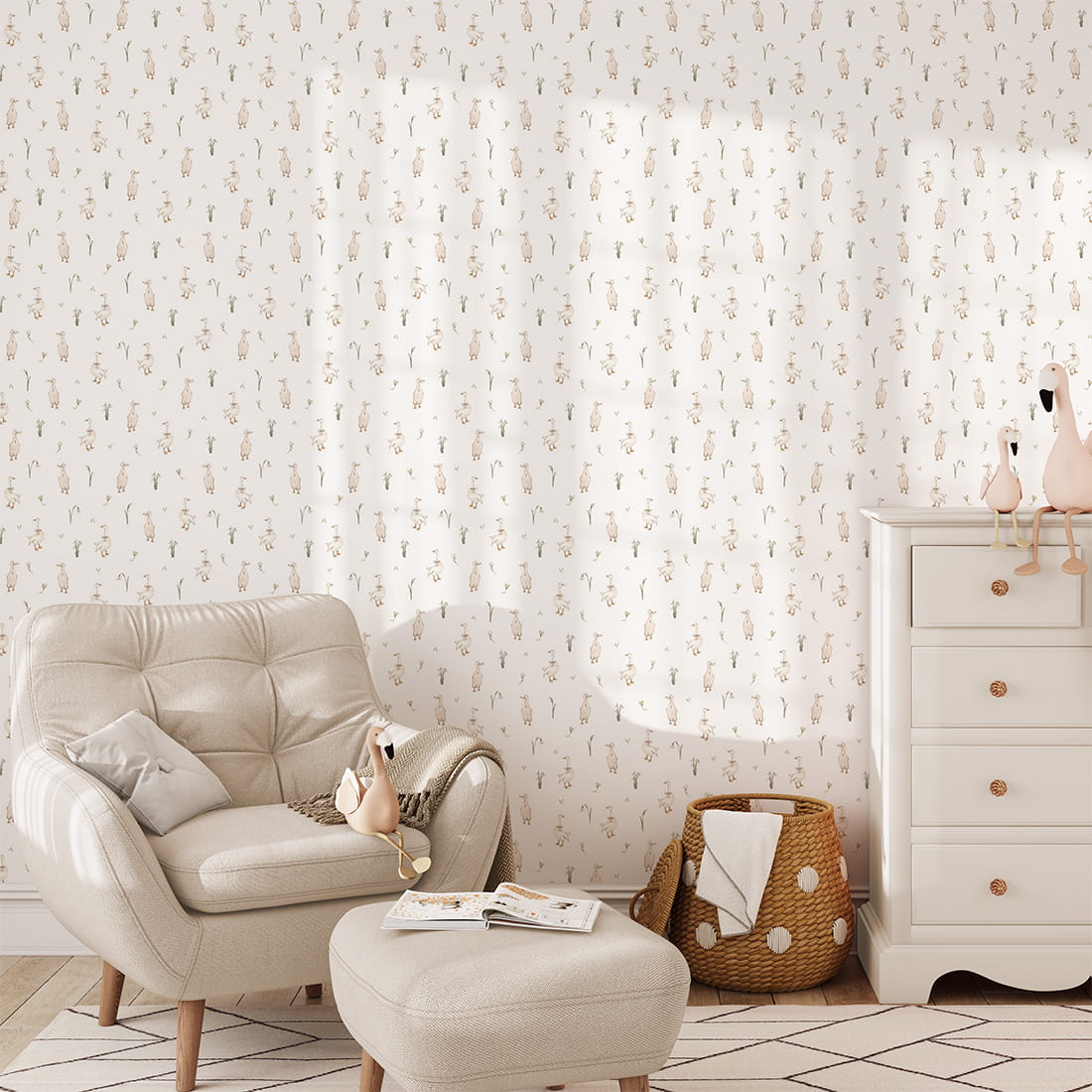 Dzięki uniwersalnej kolorystyce i stonowanemu wzornictwu tapeta w gąski doskonale komponuje się z naturalnymi dodatkami, drewnianymi meblami i pastelowymi tkaninami. To idealne tło dla przestrzeni, w której dziecko odpoczywa, bawi się i rozwija swoją wyobraźnię.
