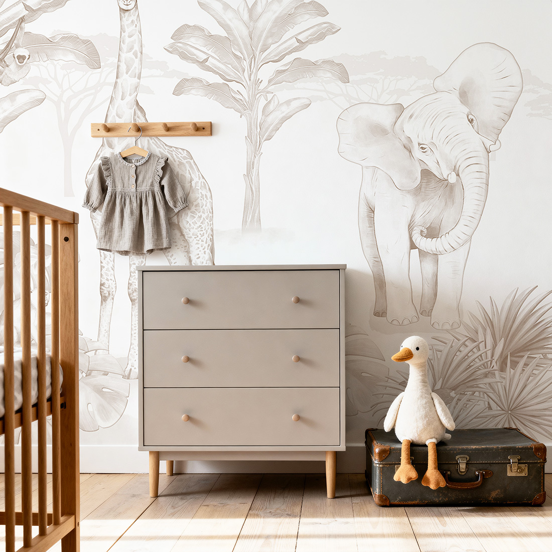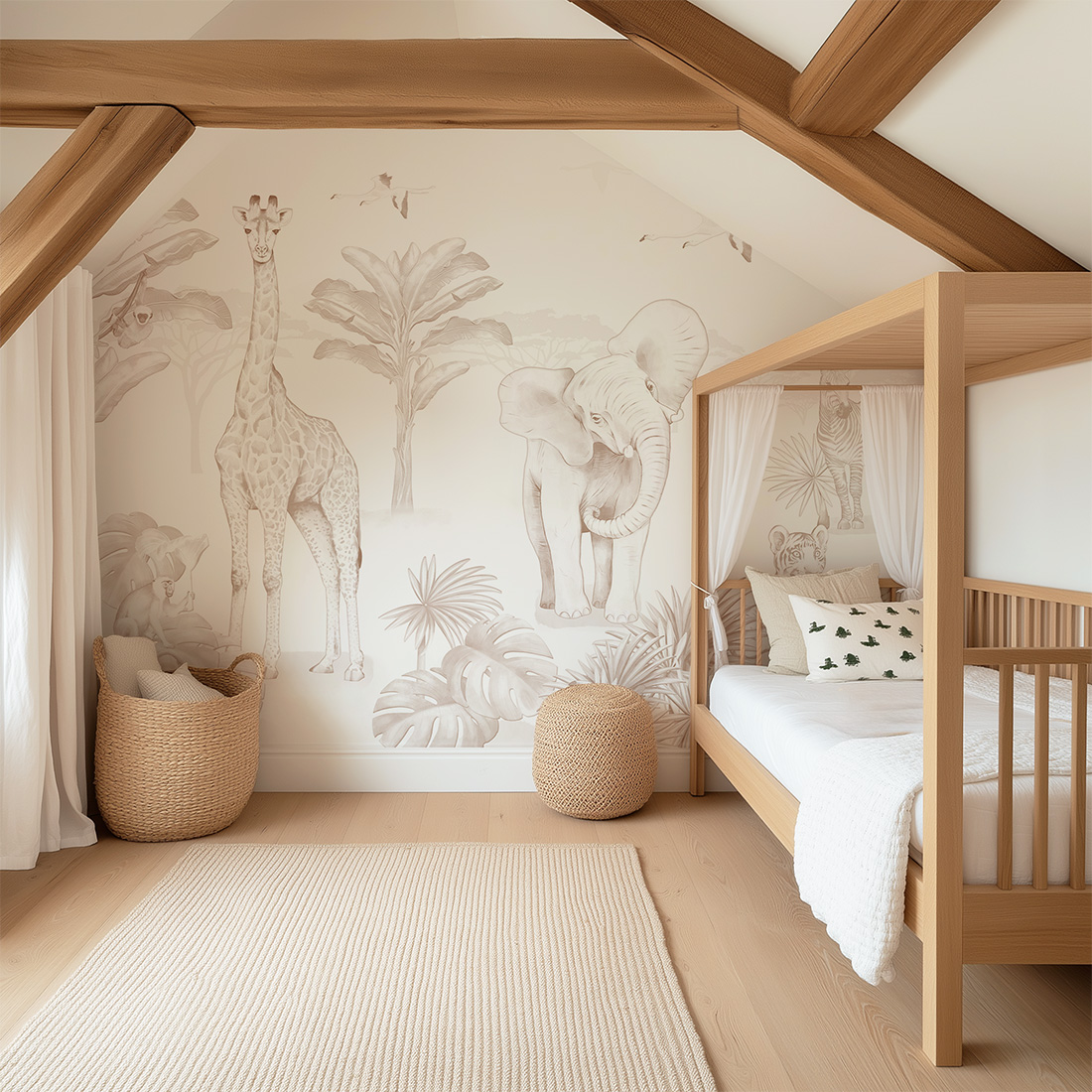Szukasz dekoracji, która zamieni pokój dziecka w oazę spokoju i harmonii? Tapeta Safari Sepia to doskonały wybór dla rodziców, którzy marzą o ponadczasowej i stonowanej aranżacji. Białe, jasne tło połączone z delikatnymi ilustracjami w odcieniach sepii oraz subtelną, cienką kreską tworzy lekką kompozycję, która idealnie wpisuje się w estetykę wnętrz boho i skandynawskich. To dekoracja, która wprowadza do wnętrza oddech i sprawia, że przestrzeń staje się jasna i przytulna.