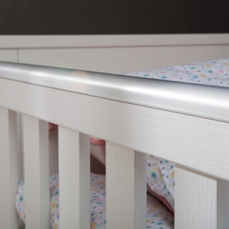 Boki ze szczebelkami są zakończone plastikową nakładką, zapobiegającą gryzieniu przez dziecko