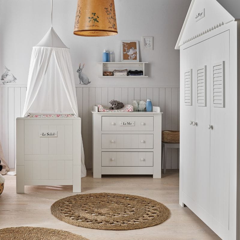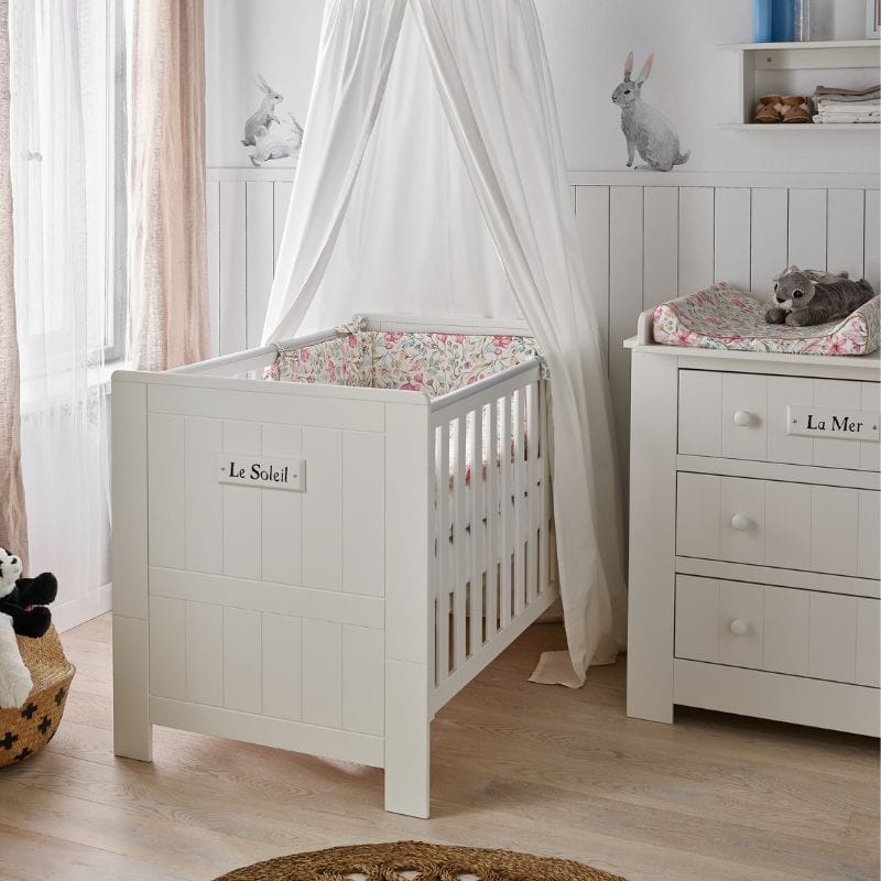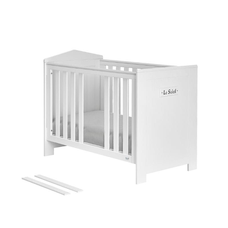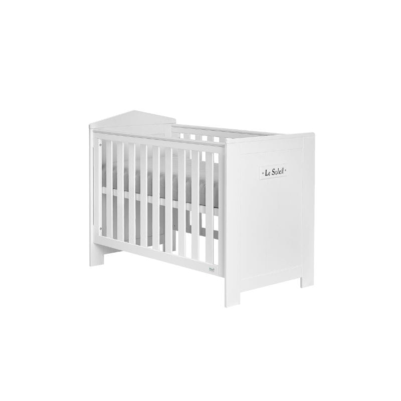 Stylowy dekor z napisem "Le Soleil", co w języku francuskim oznacza "Słońce", dodaje łóżeczku uroku i sprawia, że staje się ono wyjątkowym elementem wystroju pokoju dziecięcego.