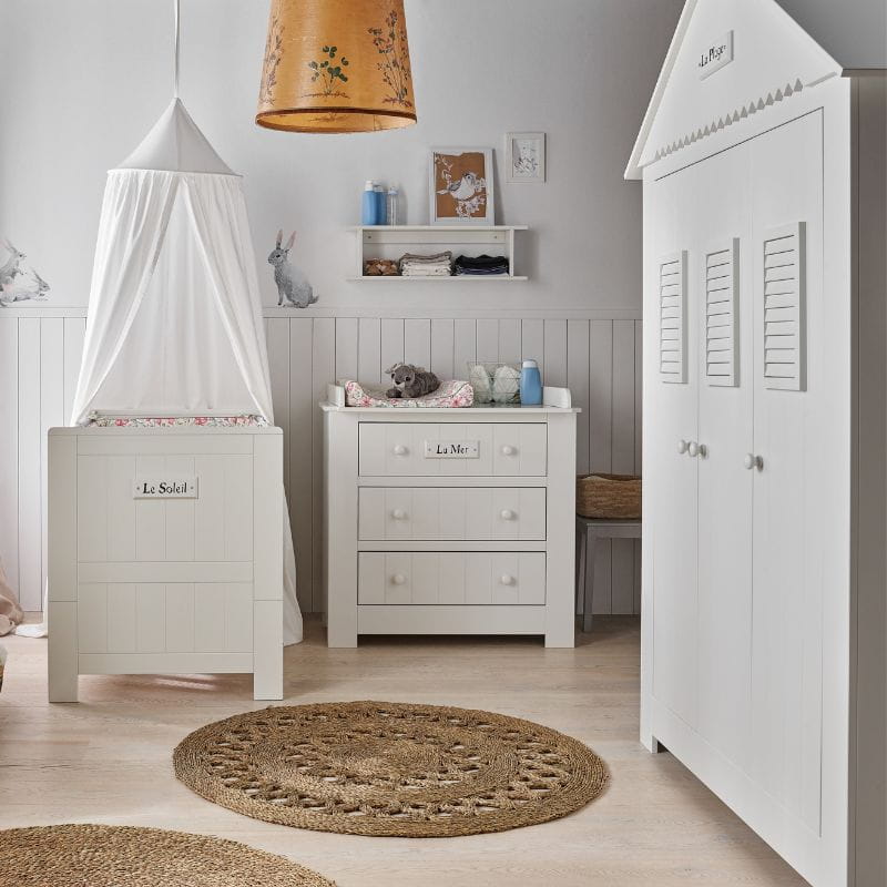 Drzwi ozdobione są subtelnym dekorem "La Plage" (fr. plaża), który dodaje szafie wyjątkowego uroku i wprowadza przytulną, wakacyjną atmosferę do wnętrza.
