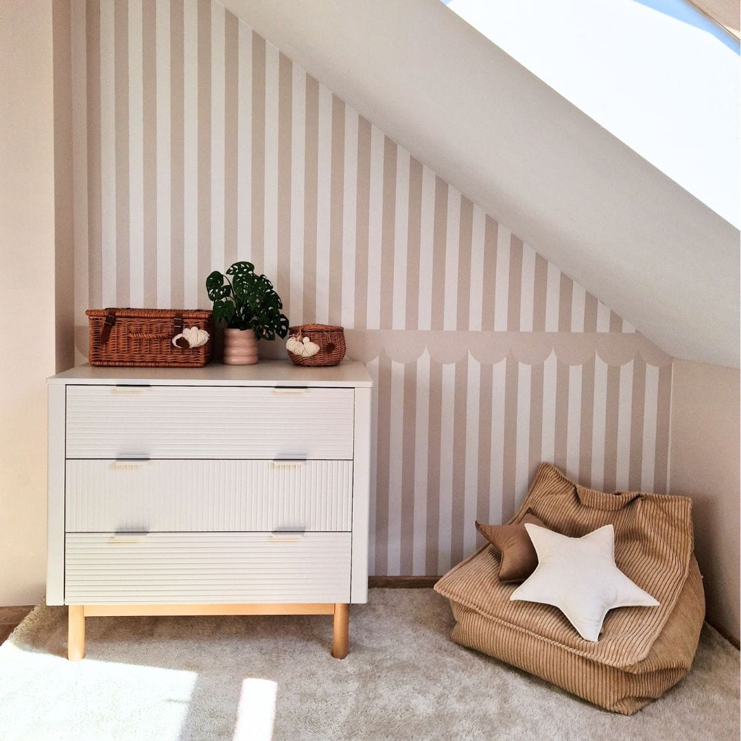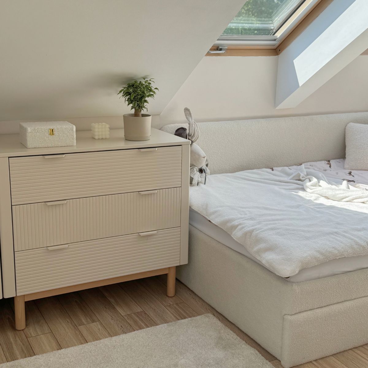 Komoda do pokoju dziecka z kolekcji Miloo posiada trzy przestronne szuflady, które działają na prowadnicach najwyższej klasy, z hamulcem oraz funkcją samodomyku. Dzięki temu każda szuflada zamyka się cicho i płynnie, co zapewnia komfort codziennego użytkowania.